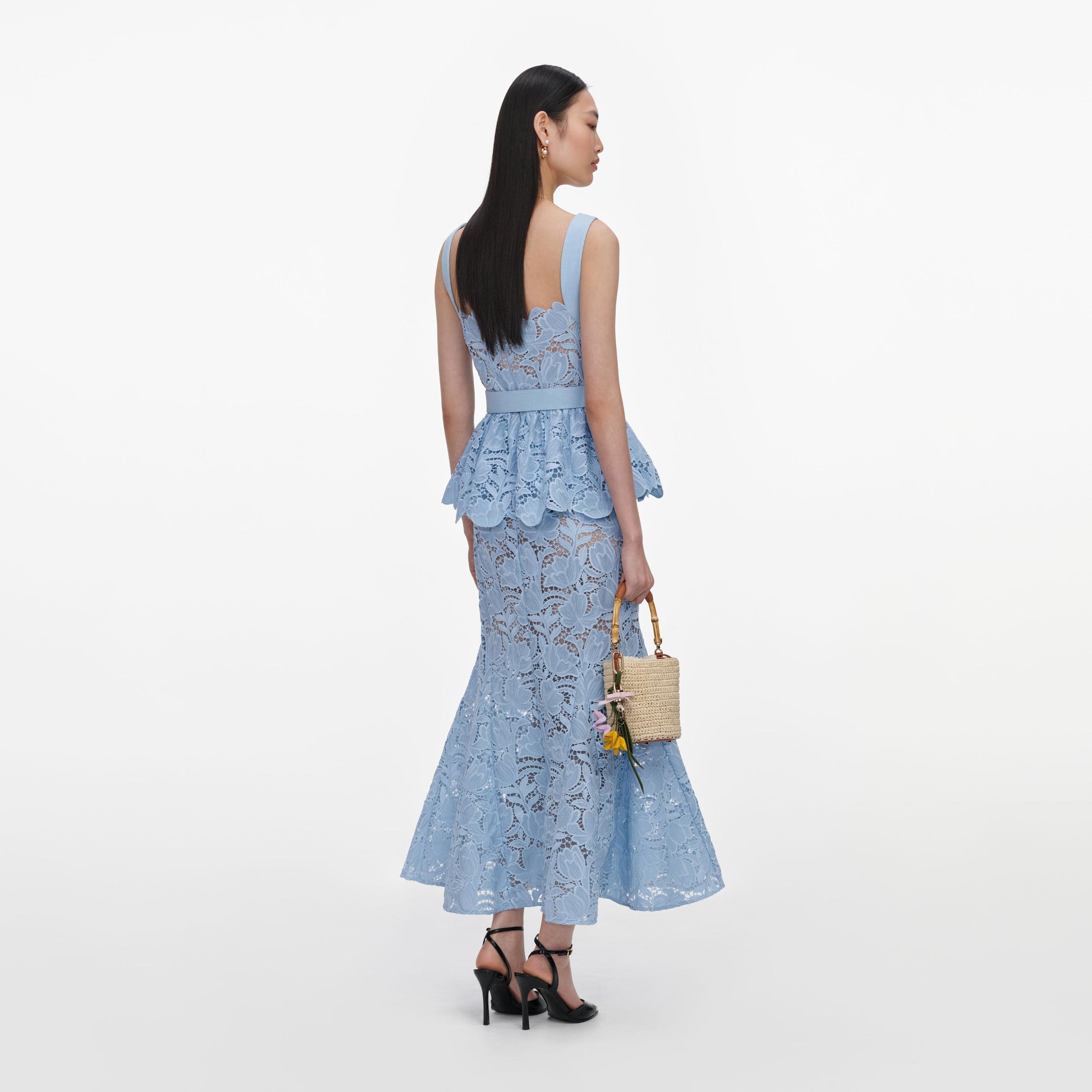 Get ready to sizzle in this midi dress, cut from baby blue lace with intricate floral detailing. A belted, peplum waist sculpts the form above its flared skirt – add heels for sun-drenched socials.Fitted styleThis style has minimal stretchConcealed zip closure at backFully linedRemovable beltModel is 5ft10/178cm and wears a size UK 6