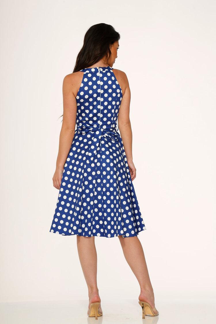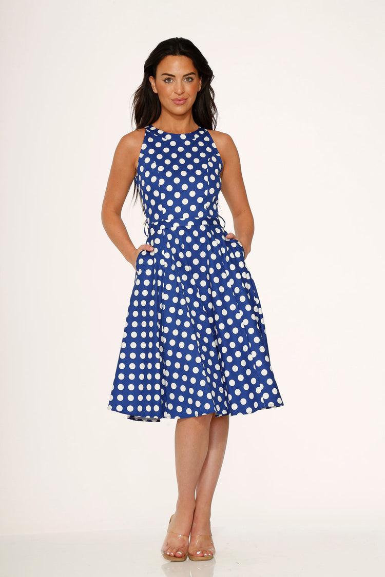 Timeless and effortlessly elegant, the Blue Polka Dot Swing Dress by Orchid Bloom is a vintage-inspired staple that never goes out of style. Featuring a navy base adorned with playful white polka dots, this flattering swing silhouette is perfect for day-to-night wear.Crafted from a cotton-spandex blend with comfortable stretch, it’s finished with a center back zipper and convenient side pockets for a touch of practicality and charm.Fabric Composition97% Cotton, 3% SpandexFabric provides stretchLength: 41"ImportedDesign DetailsCenter back zipperSide pockets