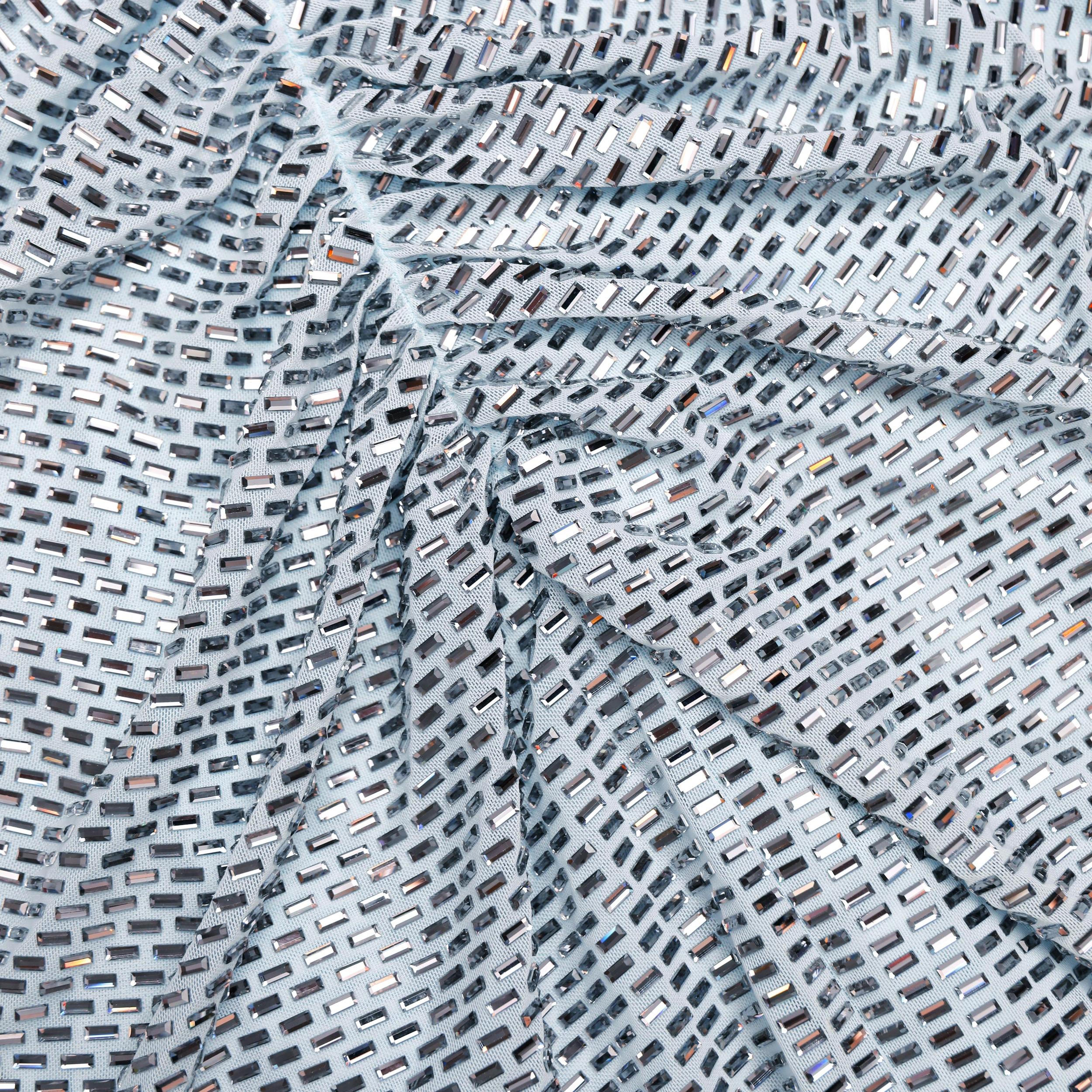 A guaranteed showstopper, this maxi dress shimmers all-over with baby blue rhinestones. The V neckline and backless cut reveal tantalising flashes of skin – ready for after-dark adventures.True to sizeFabric has stretchConcealed zip closure at backGathering detailLow cut backModel is 5ft10/178cm and wears a size UK 6