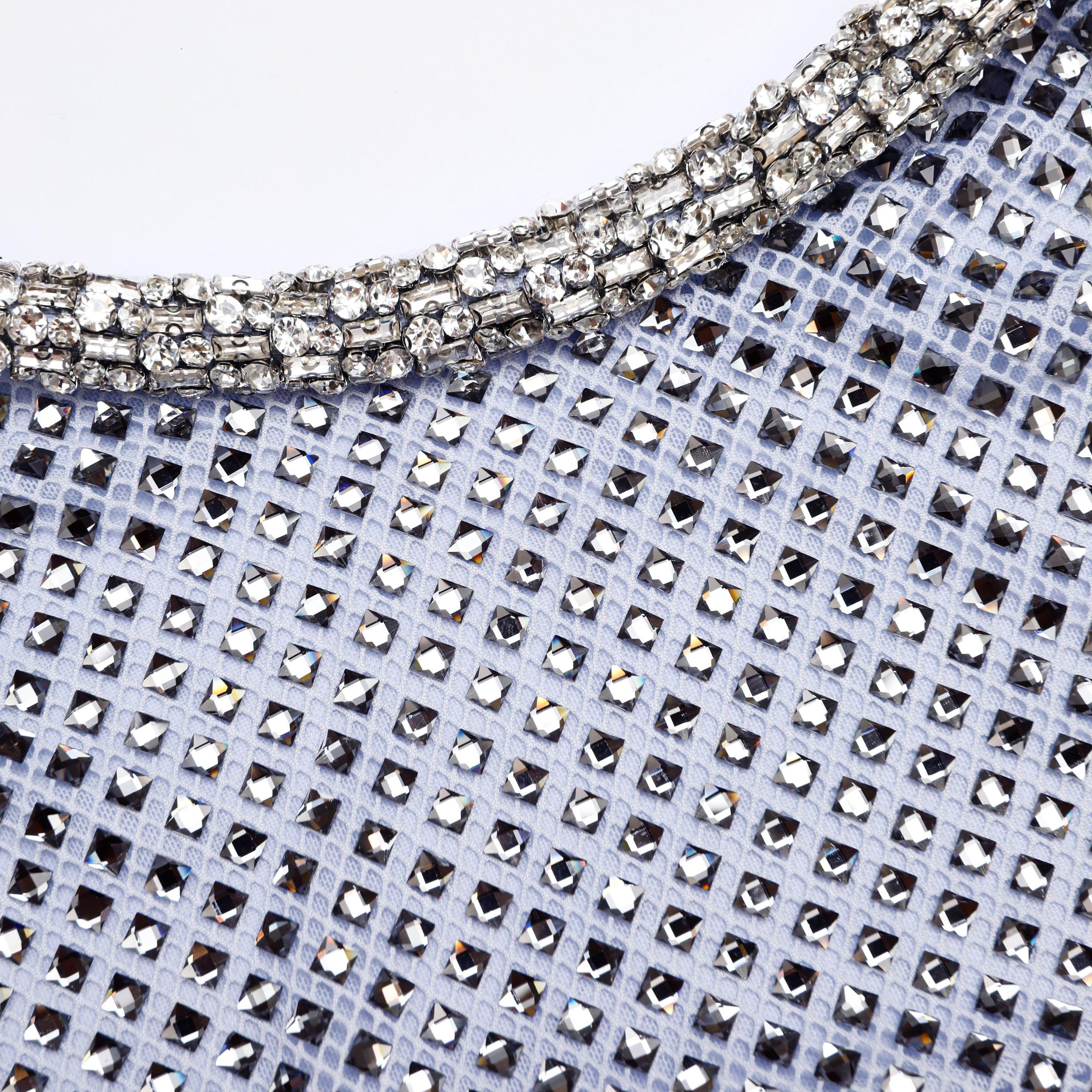 Dazzling rhinestones in chic blue bring elegant energy to this mesh midi dress. Cut with an effortless t-shirt silhouette that skims the body – style with heels for a twist on minimalist party chic.True to sizeFabric has stretchConcealed zip closure at backAsymmetric necklineMermaid hemModel is 5ft10/178cm and wears a size UK 6