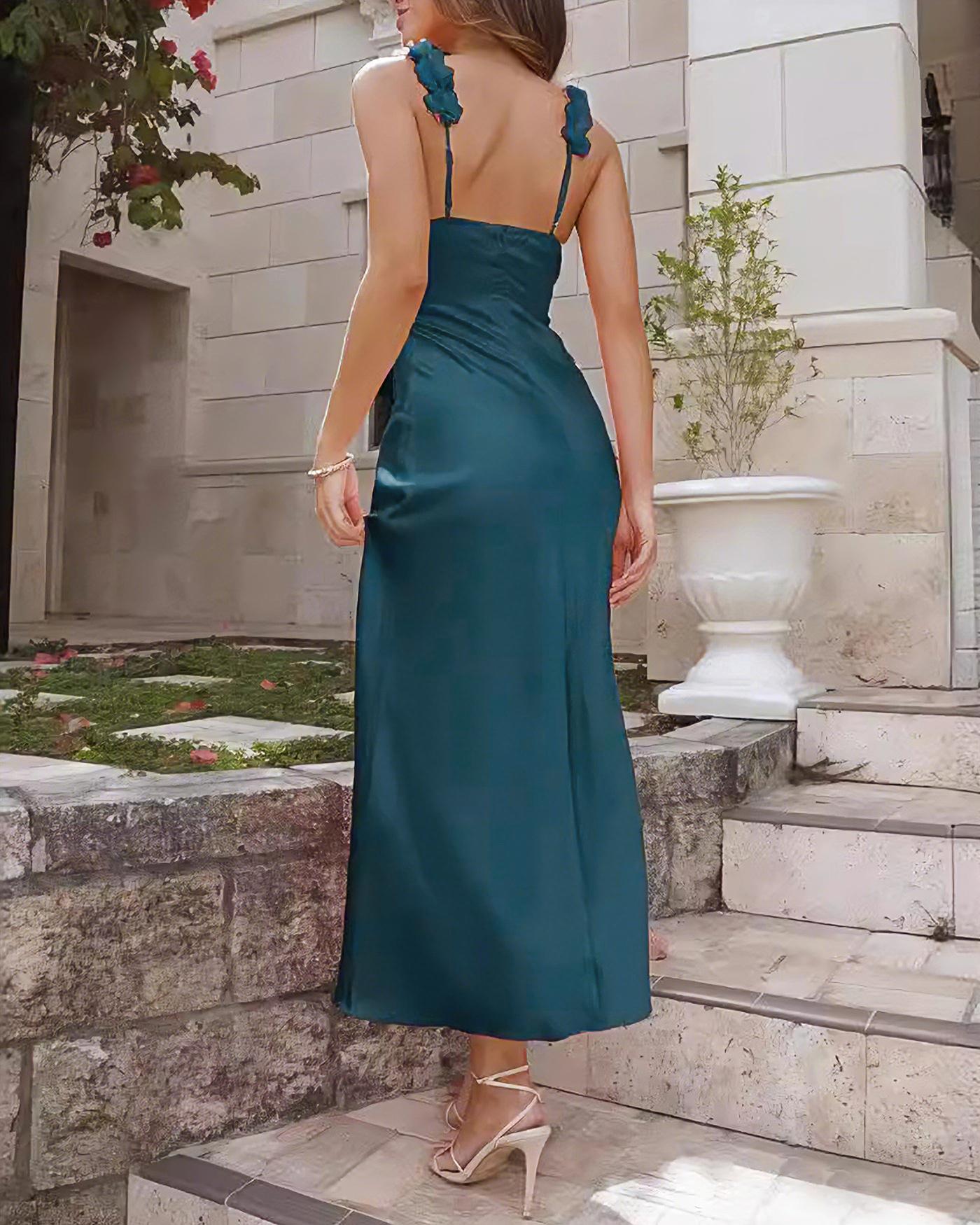 - Occasion: special occasion - Style: prom - Season: Summer, Spring - Back Neckline: Strap - Fabric Stretch: No Stretch - Waist: Natural Waisted - Sleeve Length: Sleeveless - Sleeve Type: Sleeveless - Pattern Type: Solid - Embellishment: Flowers, Zipper - Neckline: Straps - Dress Type: Slip - Silhouette: A-Line - Fabric: Polyester 95.0%, Spandex 5.0% - Lining: Polyester 95.0%, Spandex 5.0% - Material: Polyester - Pattern Style: solid