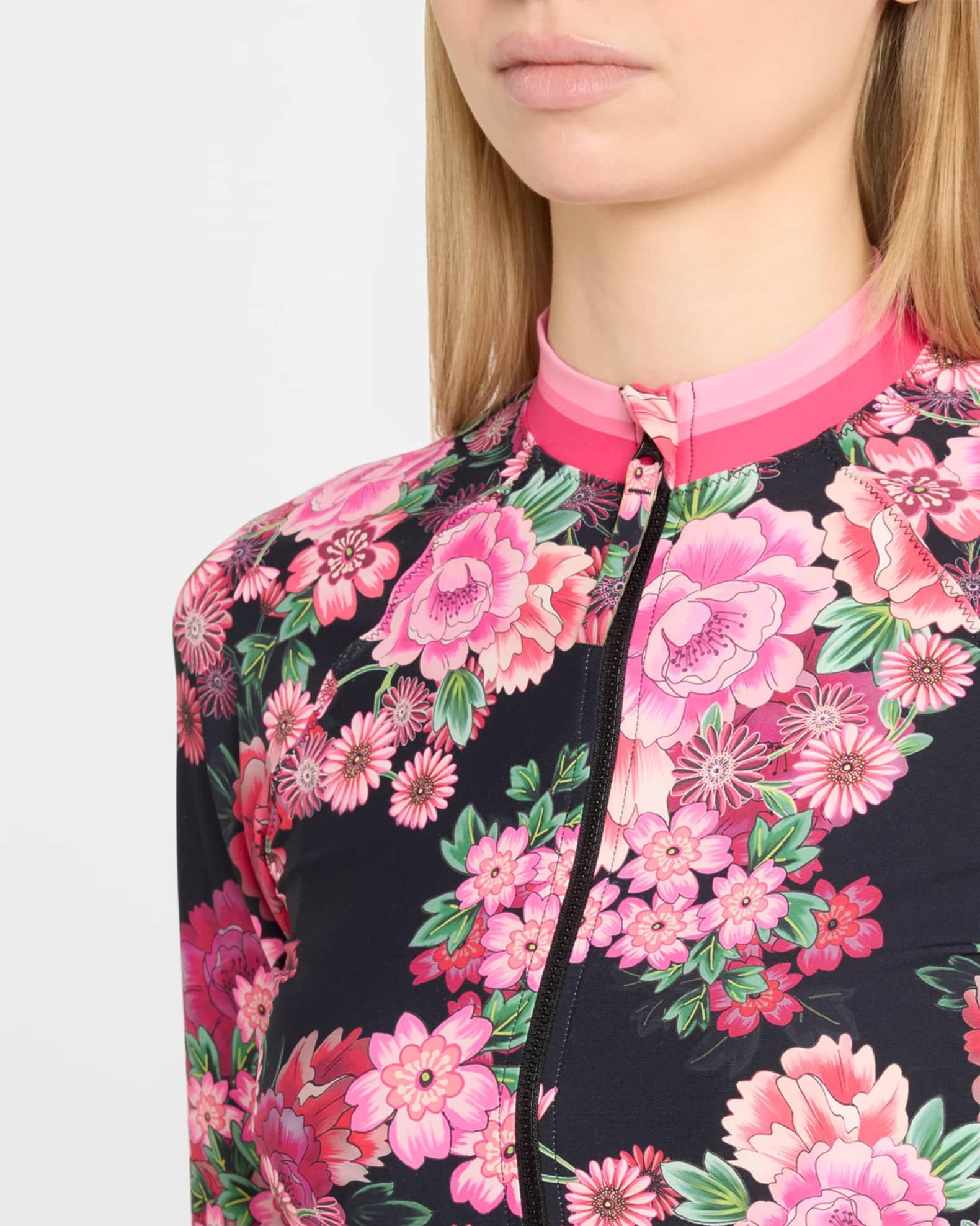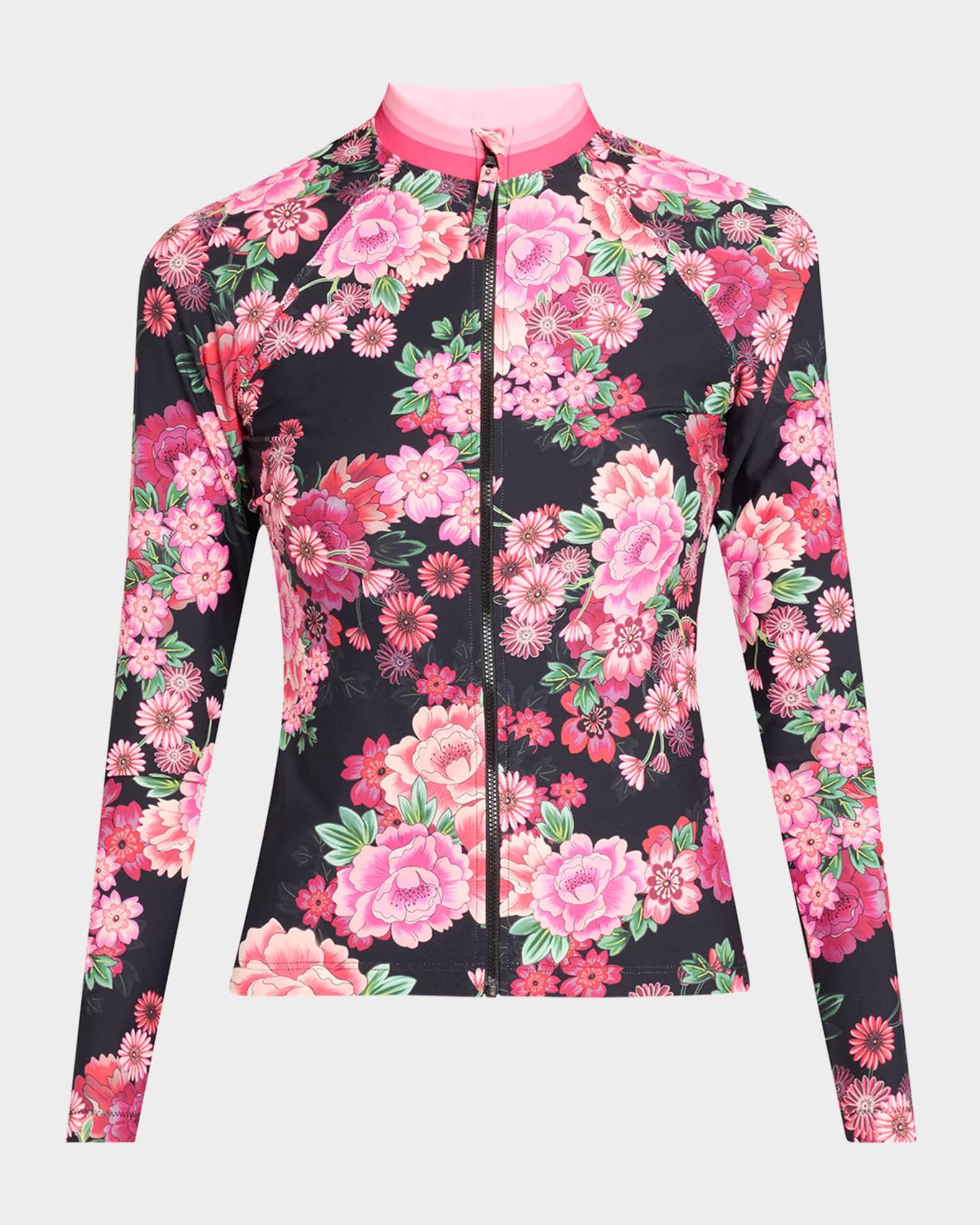 Johnny Was rashguard swim top in Blum floral print Stand collar Long raglan sleeves Hip length Slim fit Front zip closure Nylon/polyamide/elastane Lining: Nylon/elastane Hand wash Imported Bottoms sold separately Please note: This merchandise may have a distressed effect. It is a unique feature that enhances the product and is not considered a defect. Proposition 65 warning for California residents