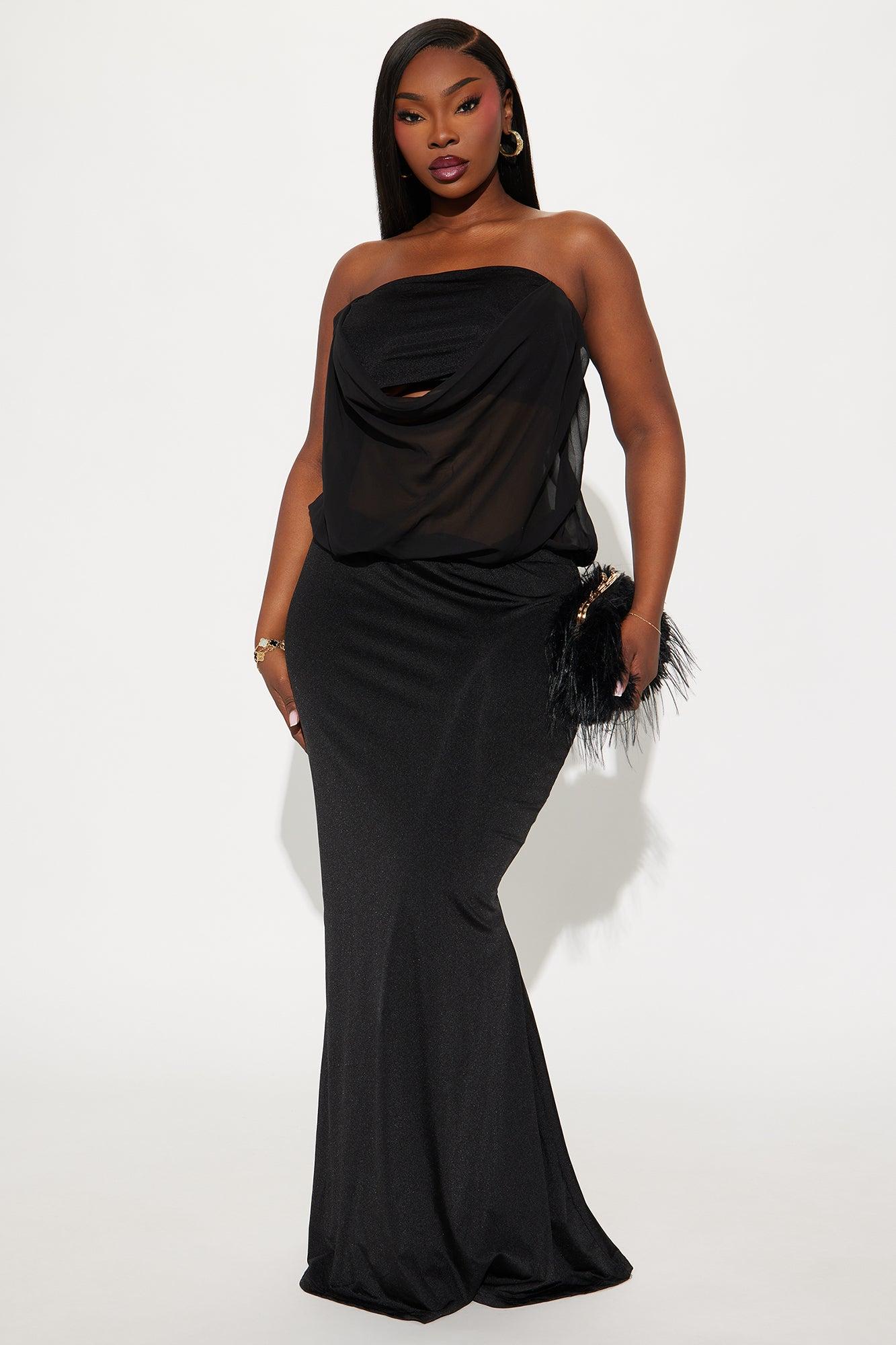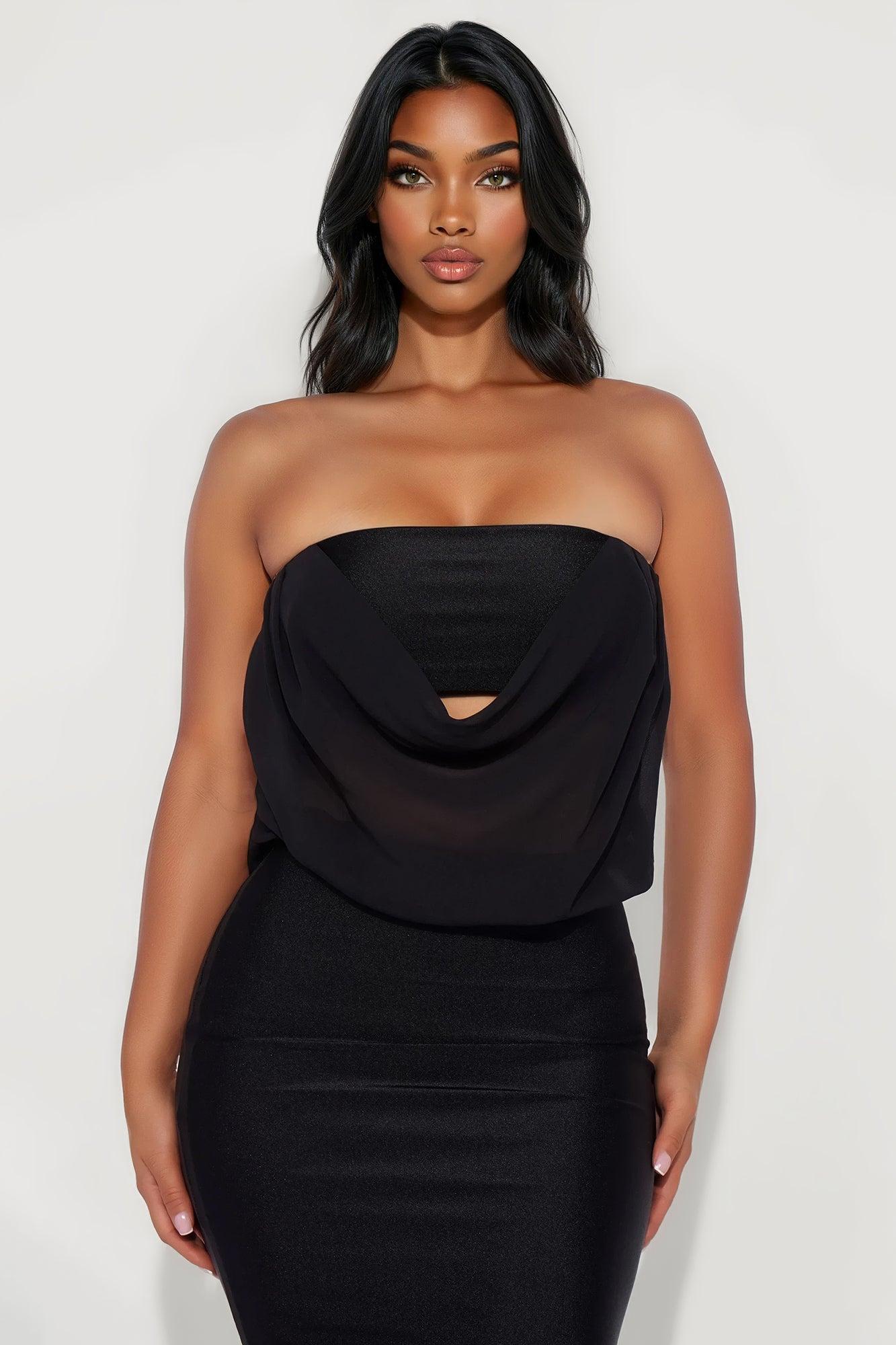 Available In Black And Red. Strapless Gown Stretch Straight Neckline Draped Chiffon Top Slinky skirt Lined Self: 82% Nylon 18% Spandex Contrast: 100% Polyester Lining: 100% Polyester Imported California Proposition 65WARNING: Cancer and Reproductive Harm - www.P65Warnings.ca.gov.