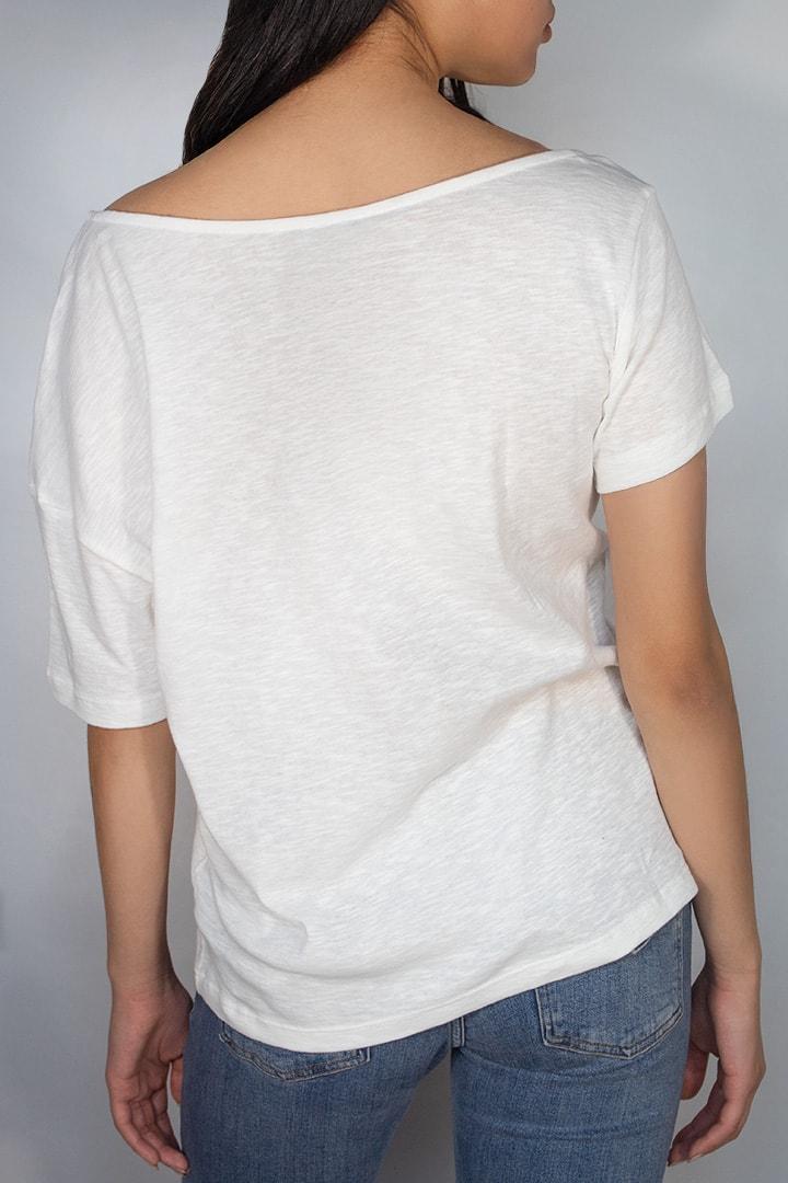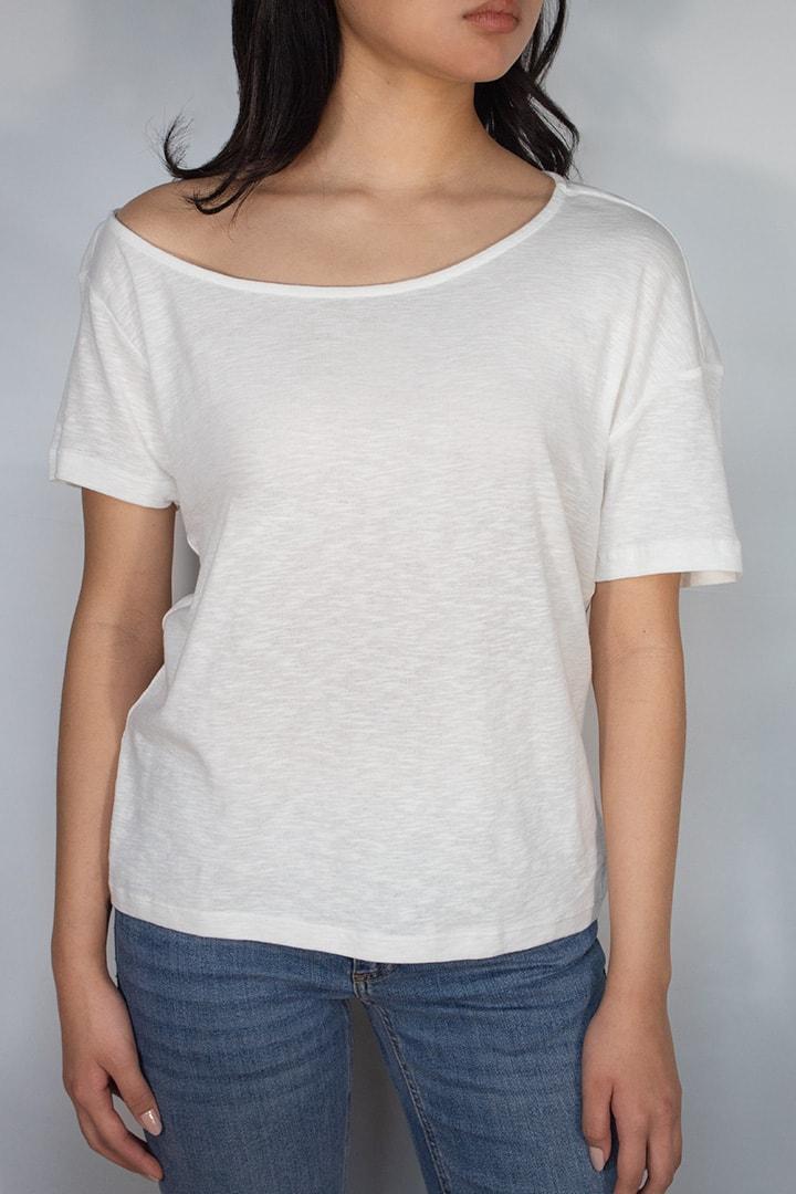 Boat neck T-shirt, short sleeves, regular length, relaxed fit.