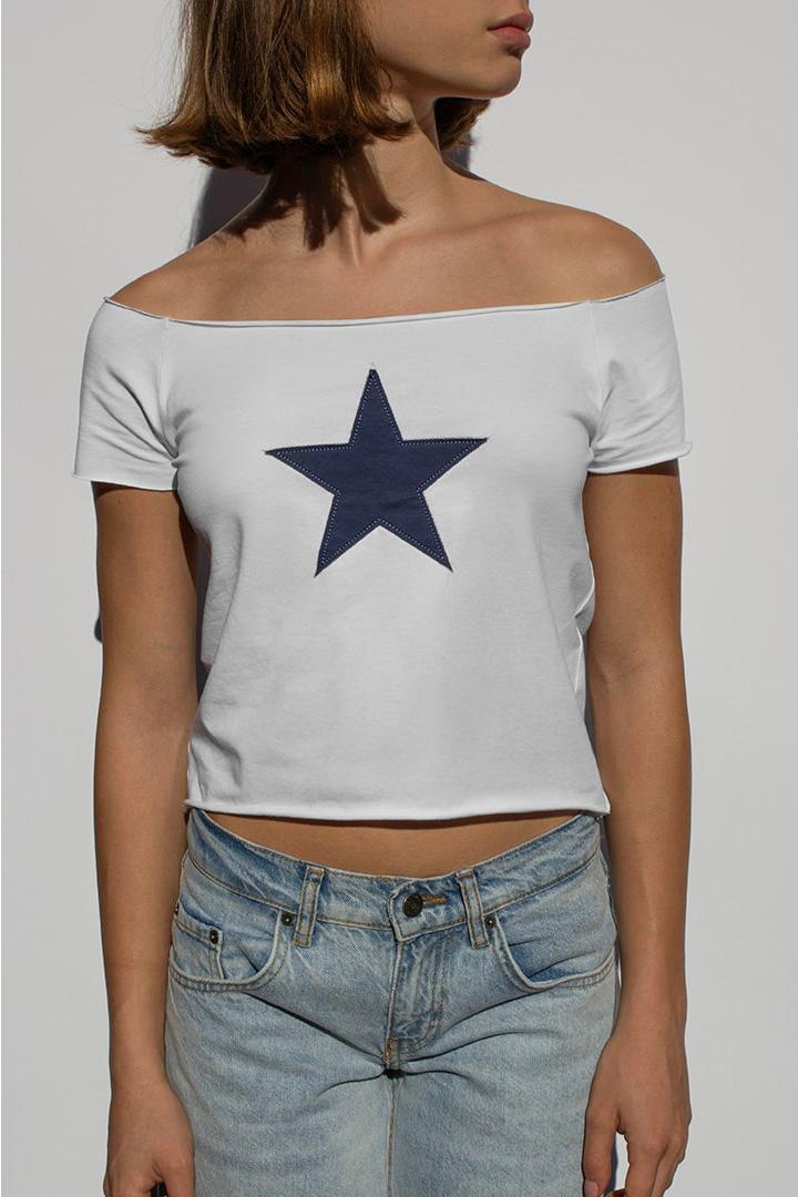 T-shirt with star patch, boat neckline, short sleeves, regular length, slim fit.