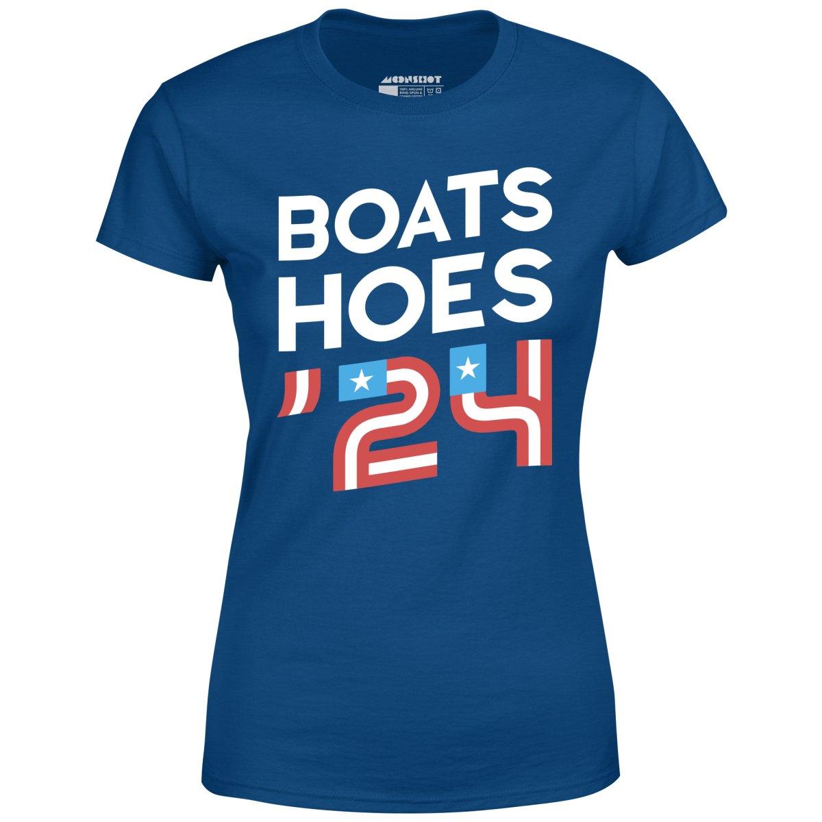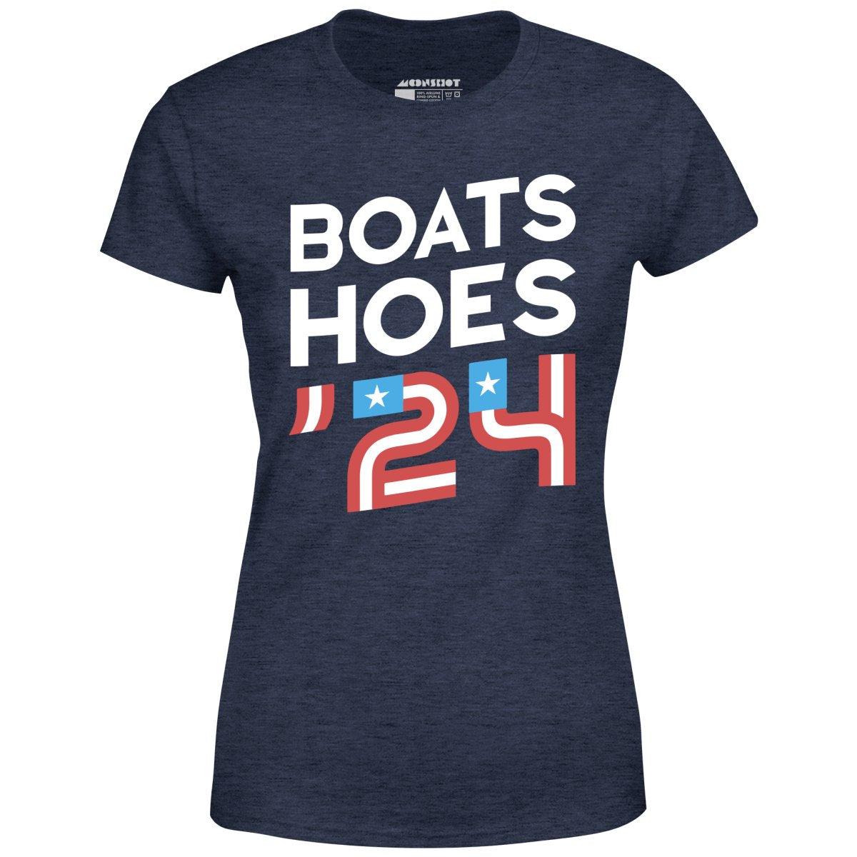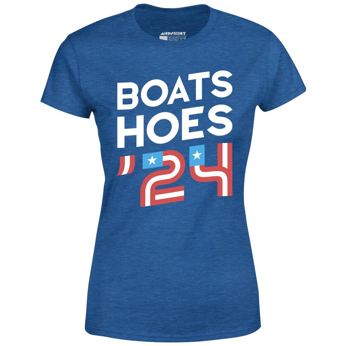Boats & Hoes! The official 2024 campaign tee. Don't forget to vote. Printed on our super soft 100% ringspun & combed cotton women's T-Shirt. Or upgrade to our Luxury 52/48 cotton/poly vintage heather edition for an even softer classic look. We print & ship all of our high quality graphic tees in the USA.