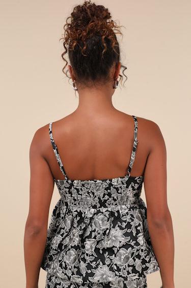 Shake up your OOTDs with an adorable piece like the Steve Madden Bodi Black Floral Jacquard Peplum Top! Sleek woven satin boasts a grey-toned jacquard design as it shapes adjustable spaghetti straps and a straight neckline. Empire-style waist tops a flaring peplum silhouette that finishes at a bubble hem. Smocking at back and hidden zipper/clasp at side. Pair with the matching skirt for a complete look!