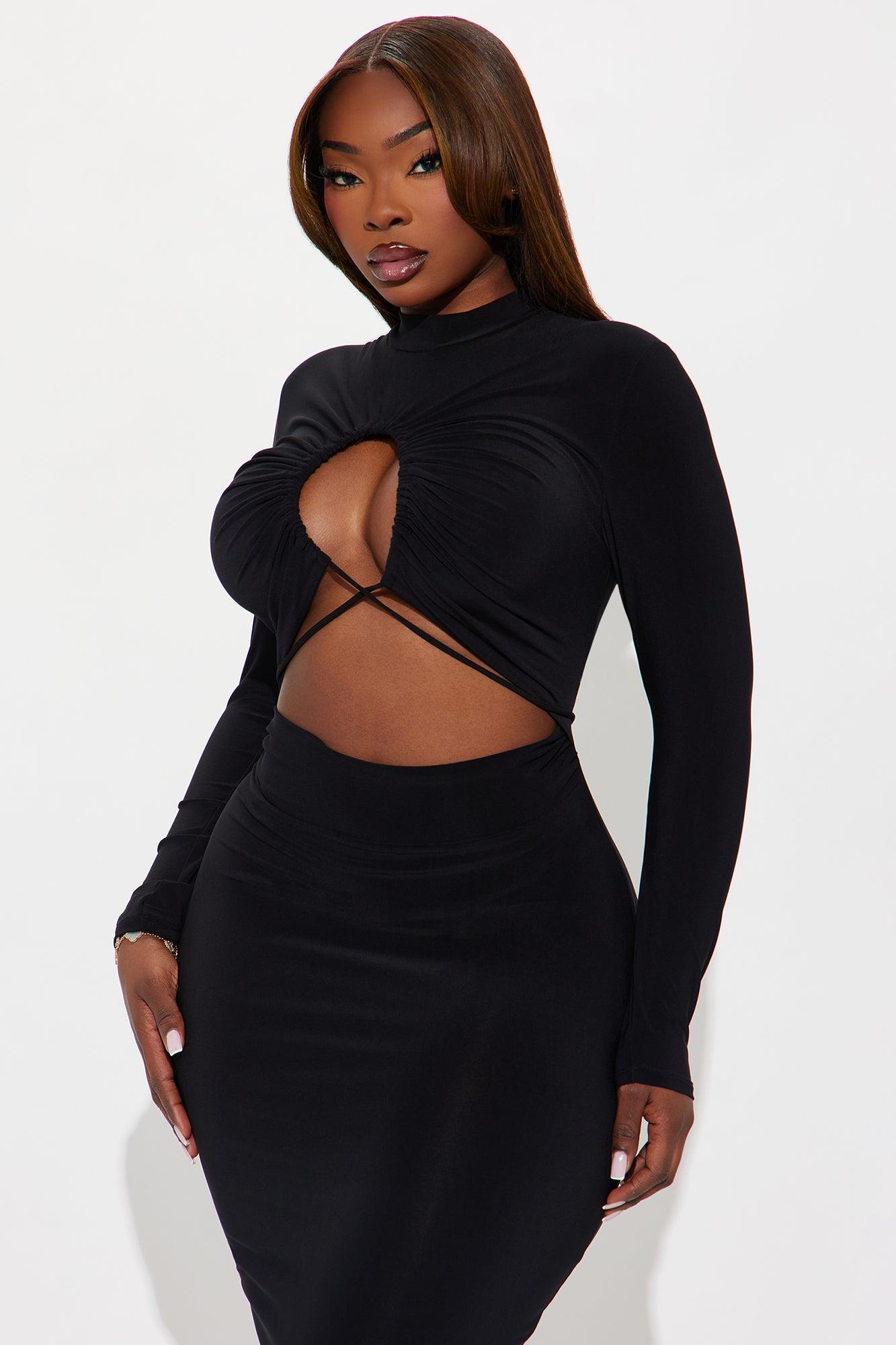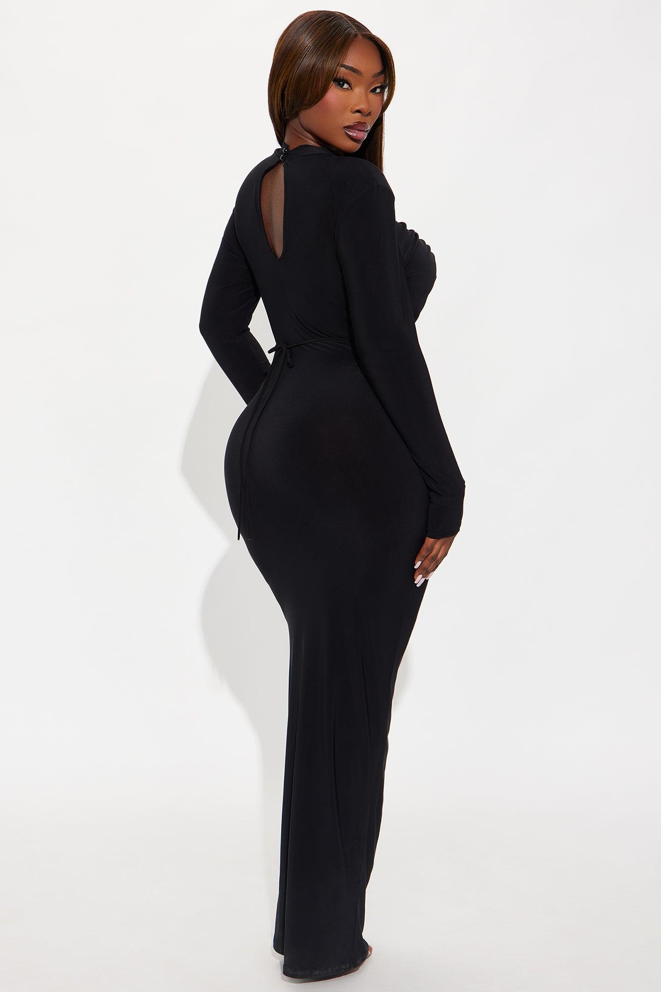 Available In Black And DarkRed. Maxi Dress Mock Neck Long Sleeve Cut Out Drawstring Detail Ruched Back Keyhole Stretch 95% Polyester 5% Spandex Imported California Proposition 65WARNING: Cancer and Reproductive Harm - www.P65Warnings.ca.gov.