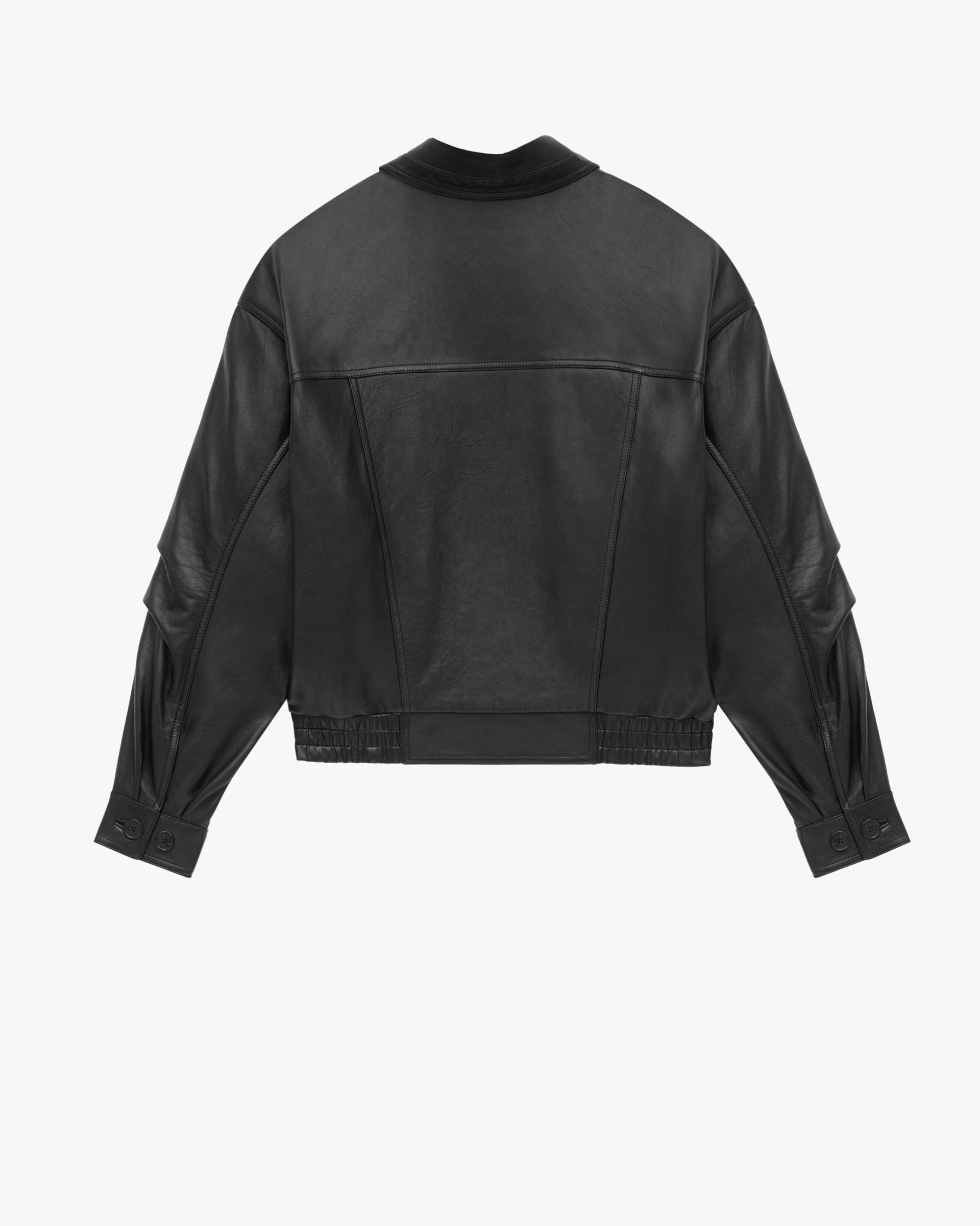 bomber jacket with a pointed collar, drop shoulders, and a shirred waistband.