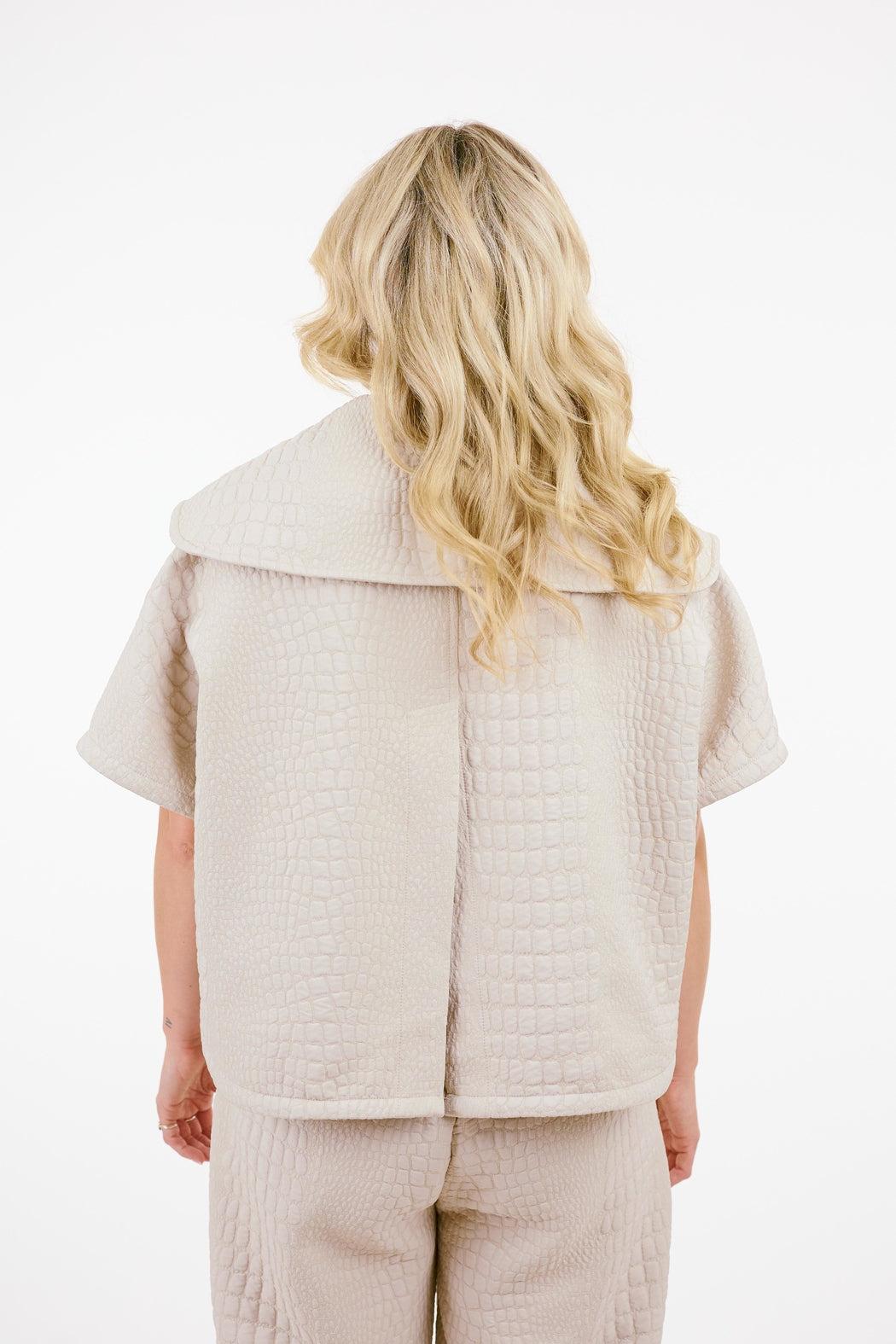 Shannon Passero - artisan made pieces that enrich the lives of the makers! Made in Canada, US, Turkey and Thailand with a thoughtful focus on a minimal environmental footprint. This bone textured crop jacket features a button front to a v-neck & lapel, cap dolman sleeves, a curved hem, a back slit, a boxy relaxed cut and front pockets. Made from a soft textured fabric in bone. Pair with the matching pants!