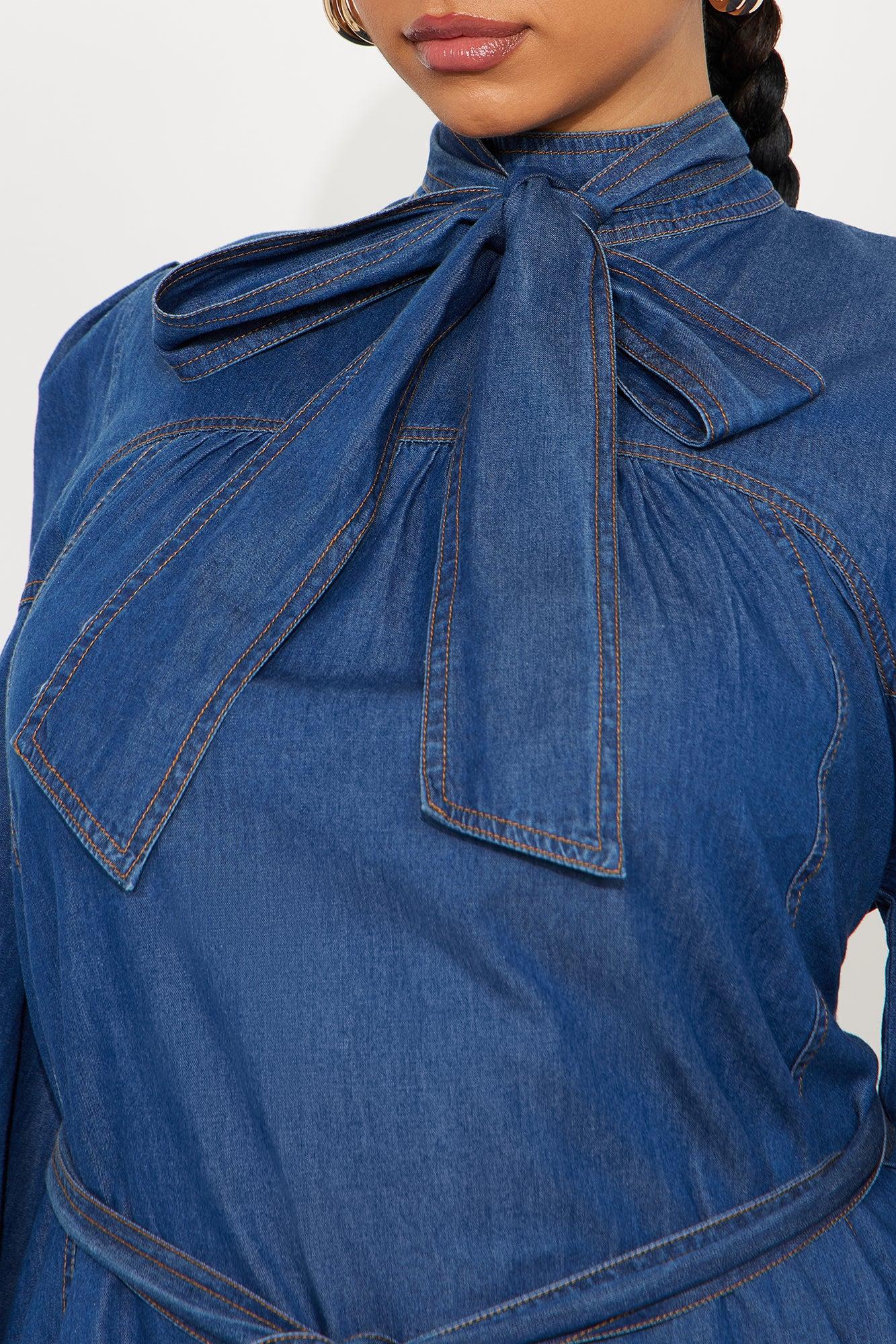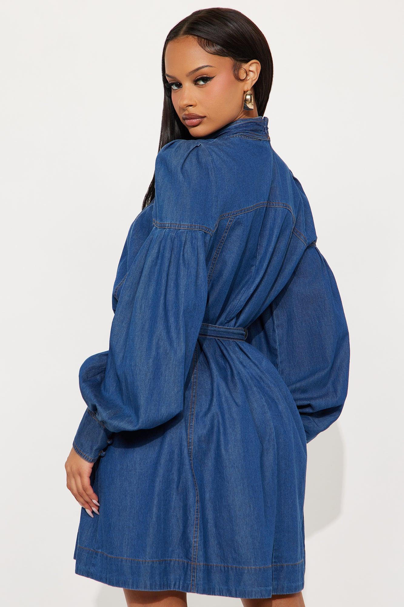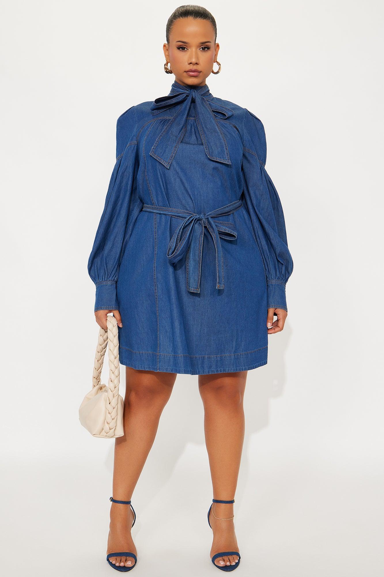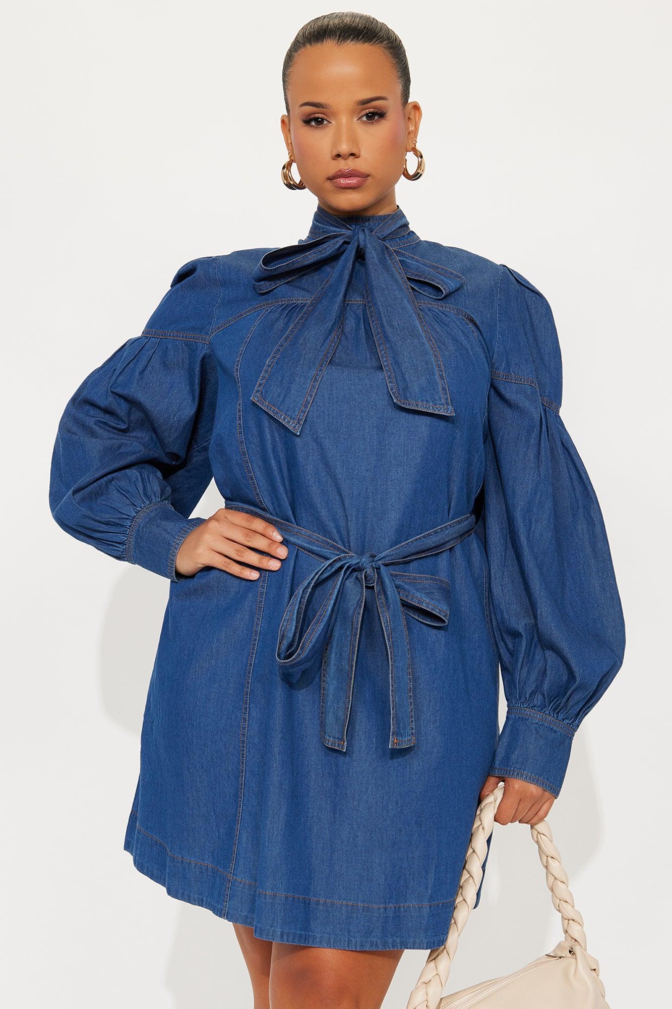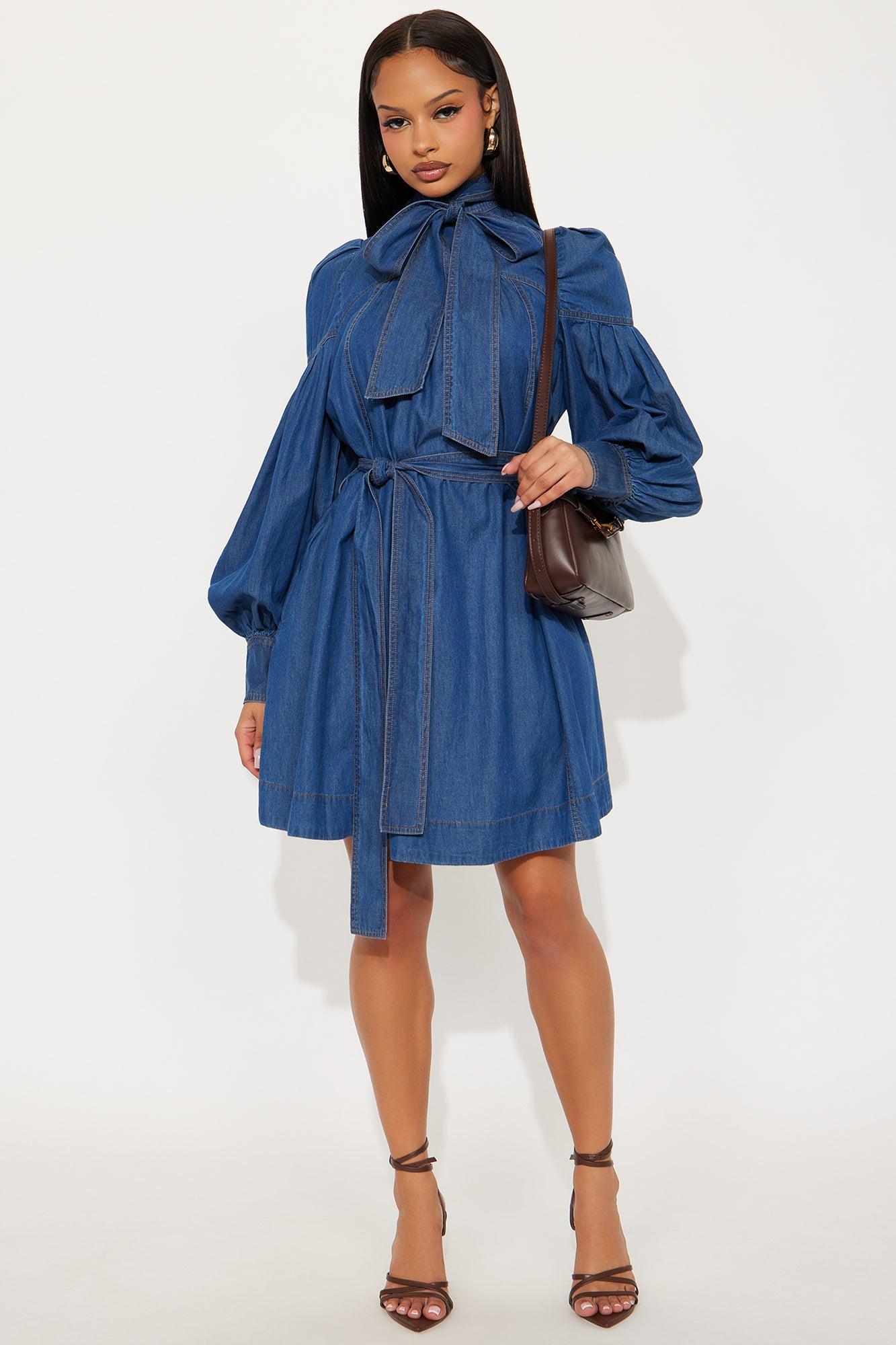 Available In Denim. Denim Mini Dress Mock Neckline Long Sleeves Tie Neck Tie Waist Back Zipper Length Measured Flat = 34" Disclaimer Due To The Specialized Wash Process, Each Garment Is Unique. Self: 100% Cotton Imported