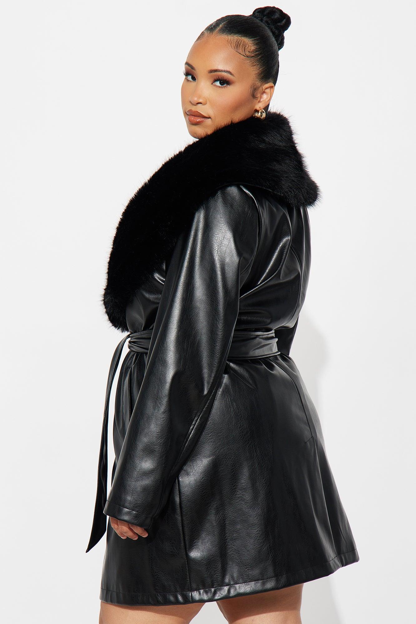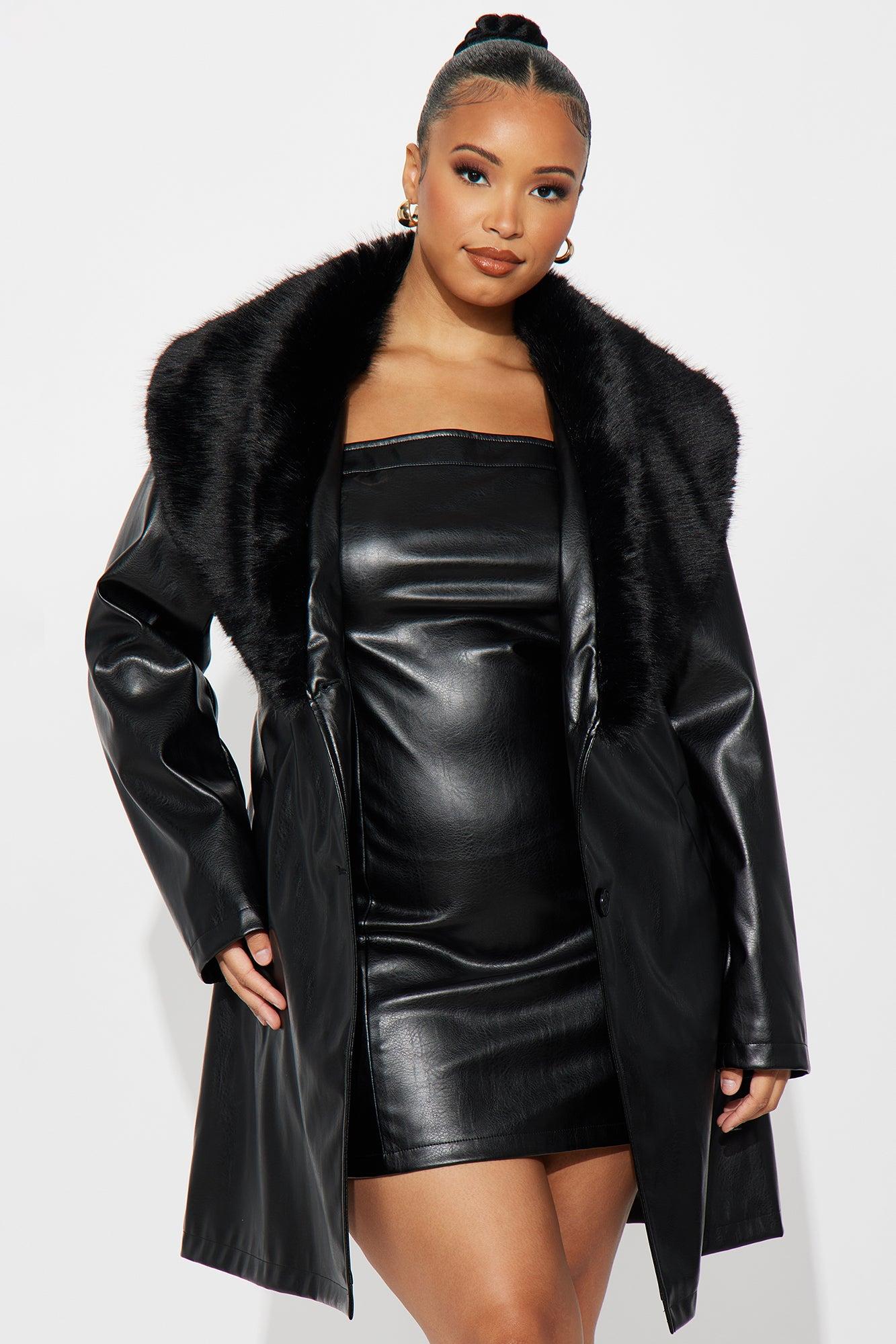 Available In Black And Cognac. Faux Leather Midi Dress Straight Neckline Strapless Back Zipper, Back Slit Fur Trim Crop Jacket Stretch Length Measured Flat = 40" Dress: Shell Facing: 100% Polyurethane Backing: 100% Viscose Coat: Shell Facing: 100% Polyurethane Backing: 100% Polyester Lining: 100% Polyester Faux Fur Trim: 100% Polyester Imported California Proposition 65WARNING: Cancer and Reproductive Harm - www.P65Warnings.ca.gov.