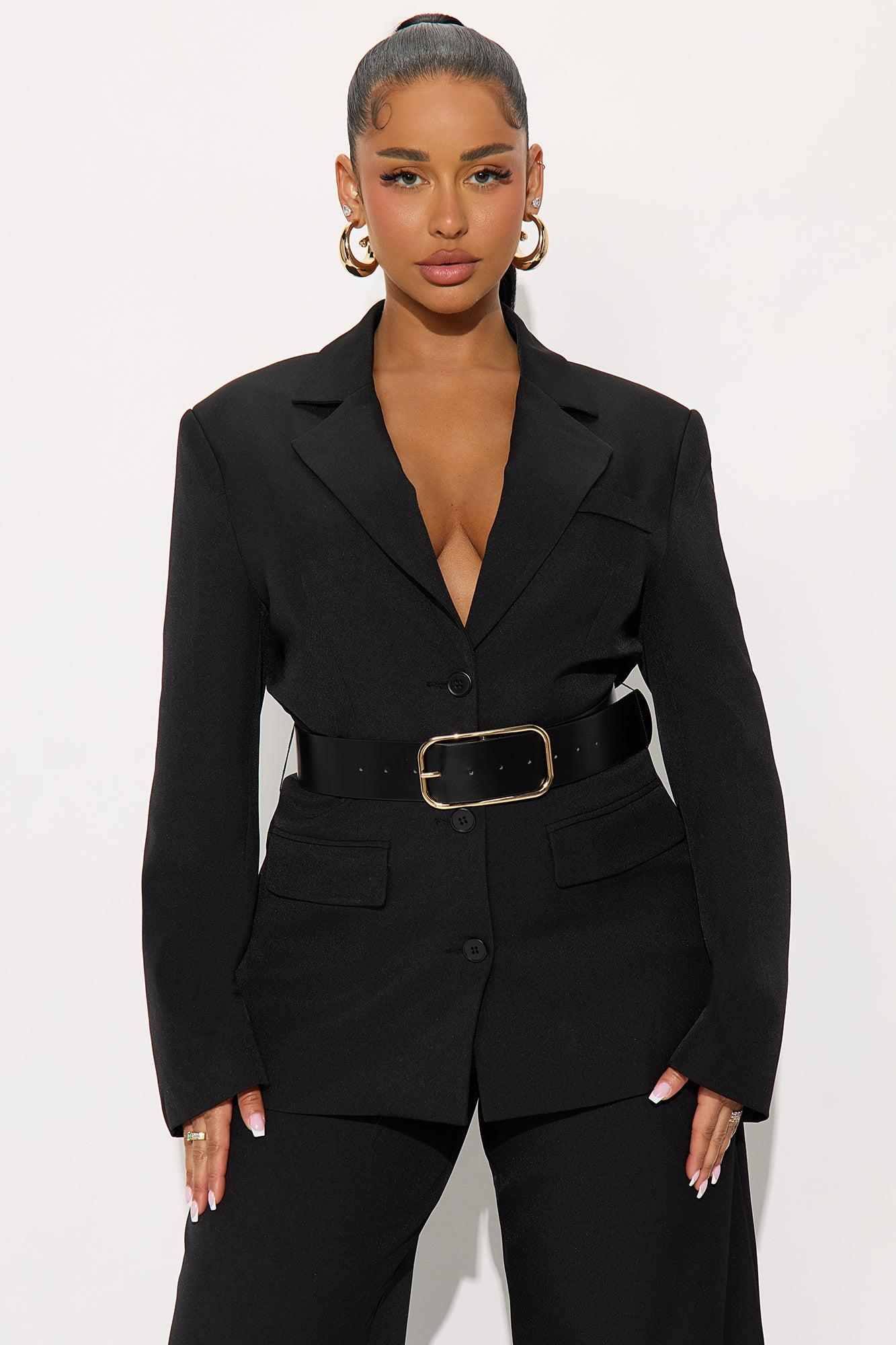 Available In Black And Olive. 3 Piece Ensemble Belt, Blazer And Wide Leg Pant Set Non Stretch 33" Inseam Shoulder Pads Detachable Belt Front Clasp And Zipper Pant Closure Pockets Self: 95% Polyester 5% Spandex Lining: 100% Polyester Imported