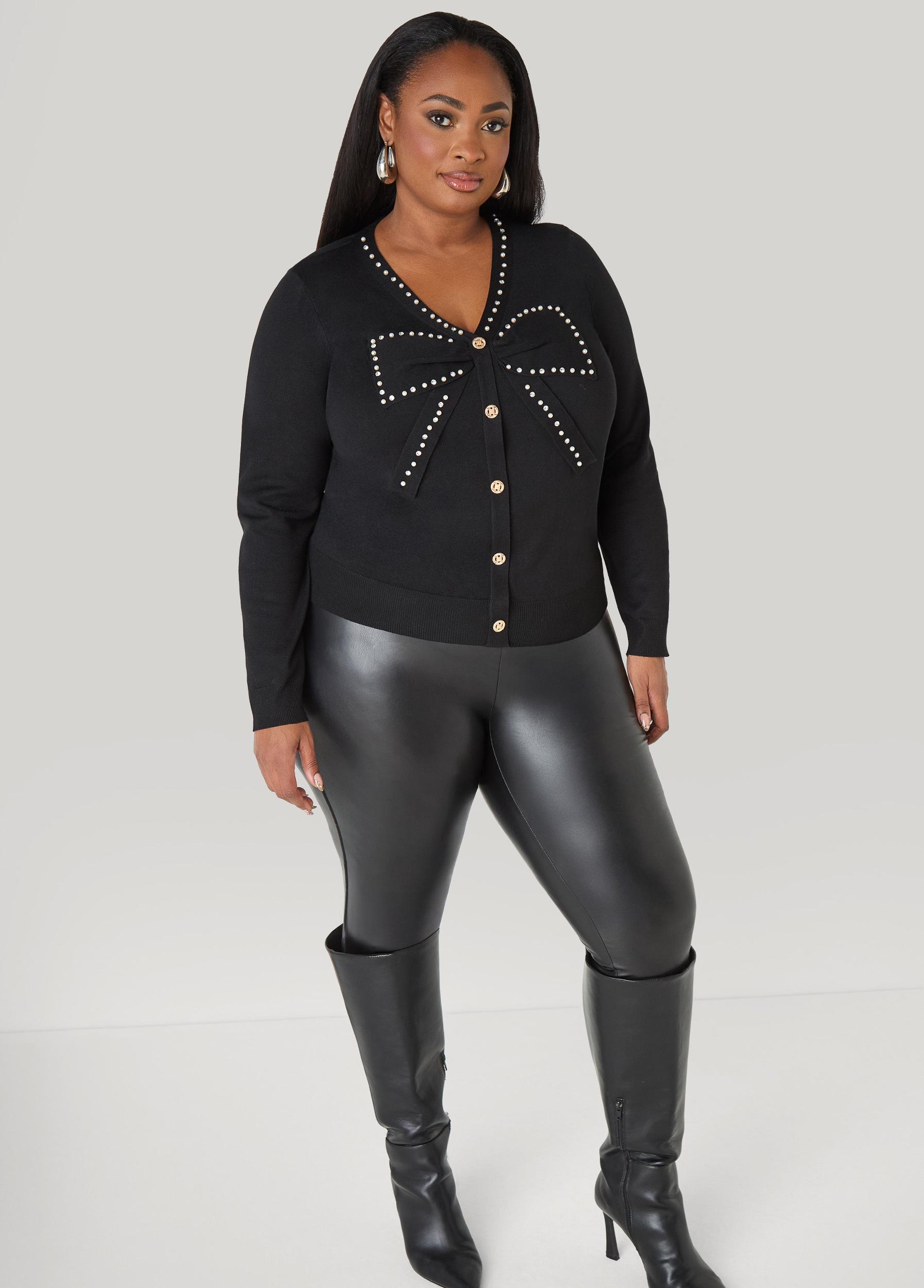 This knitted sweater is adorned with a bow appliqué, crystal accents, and decorative buttons placed along the front for a trompe-l’œil finish. The embellishment feels delicate and deliberate, creating the look of a classic cardigan with a quietly ornate twist.
