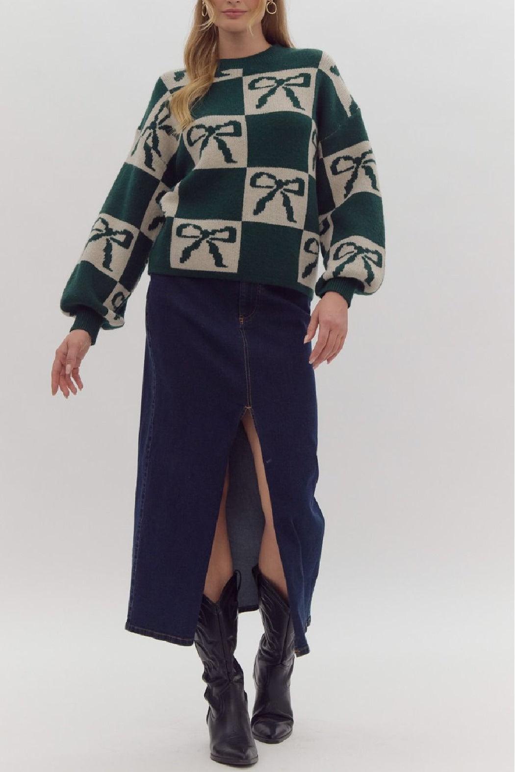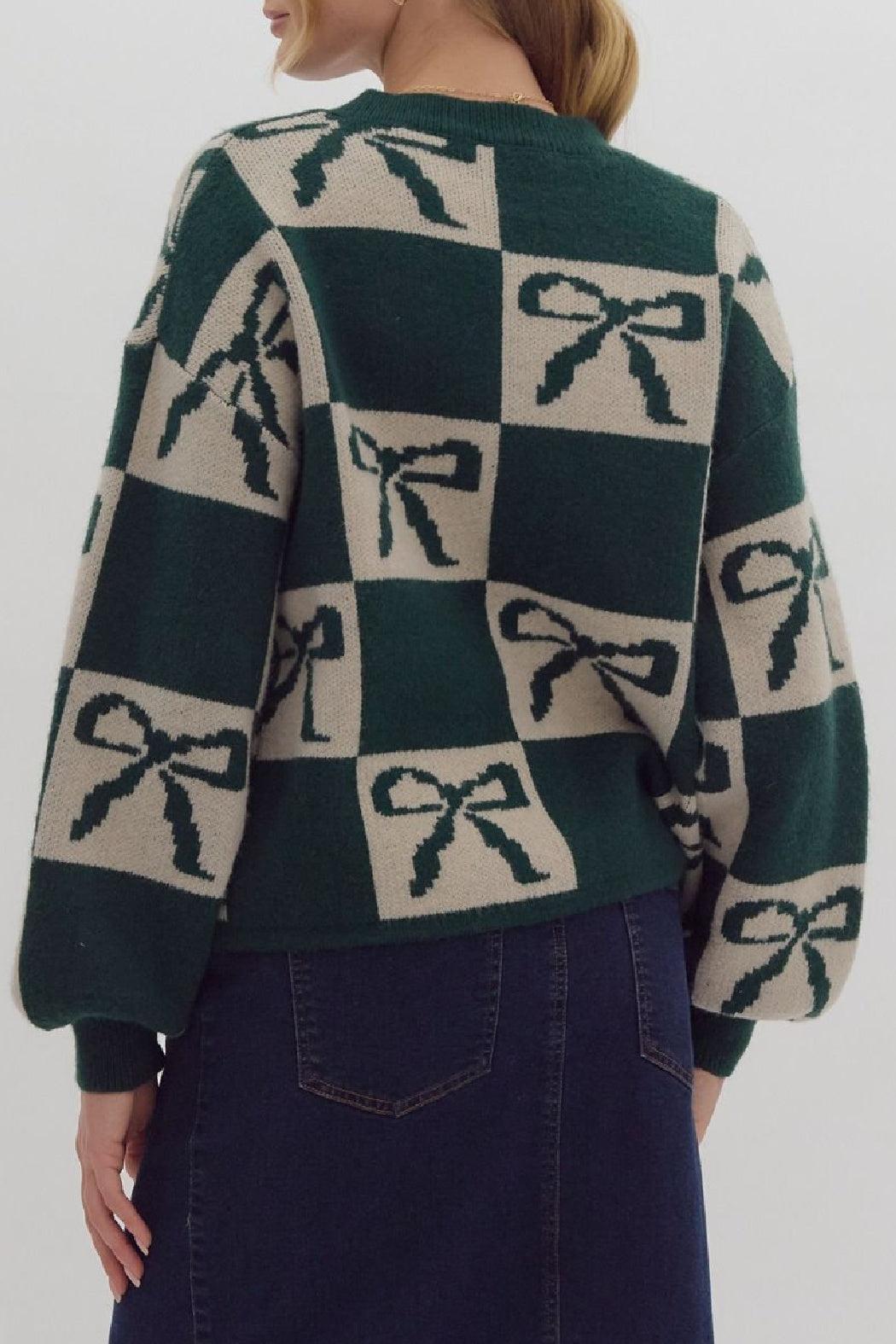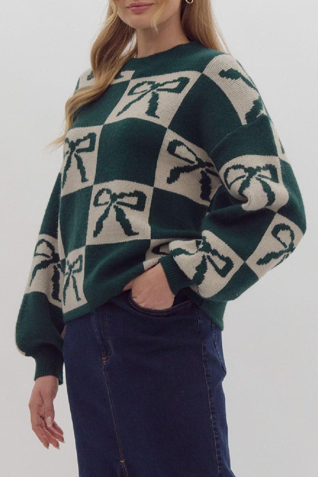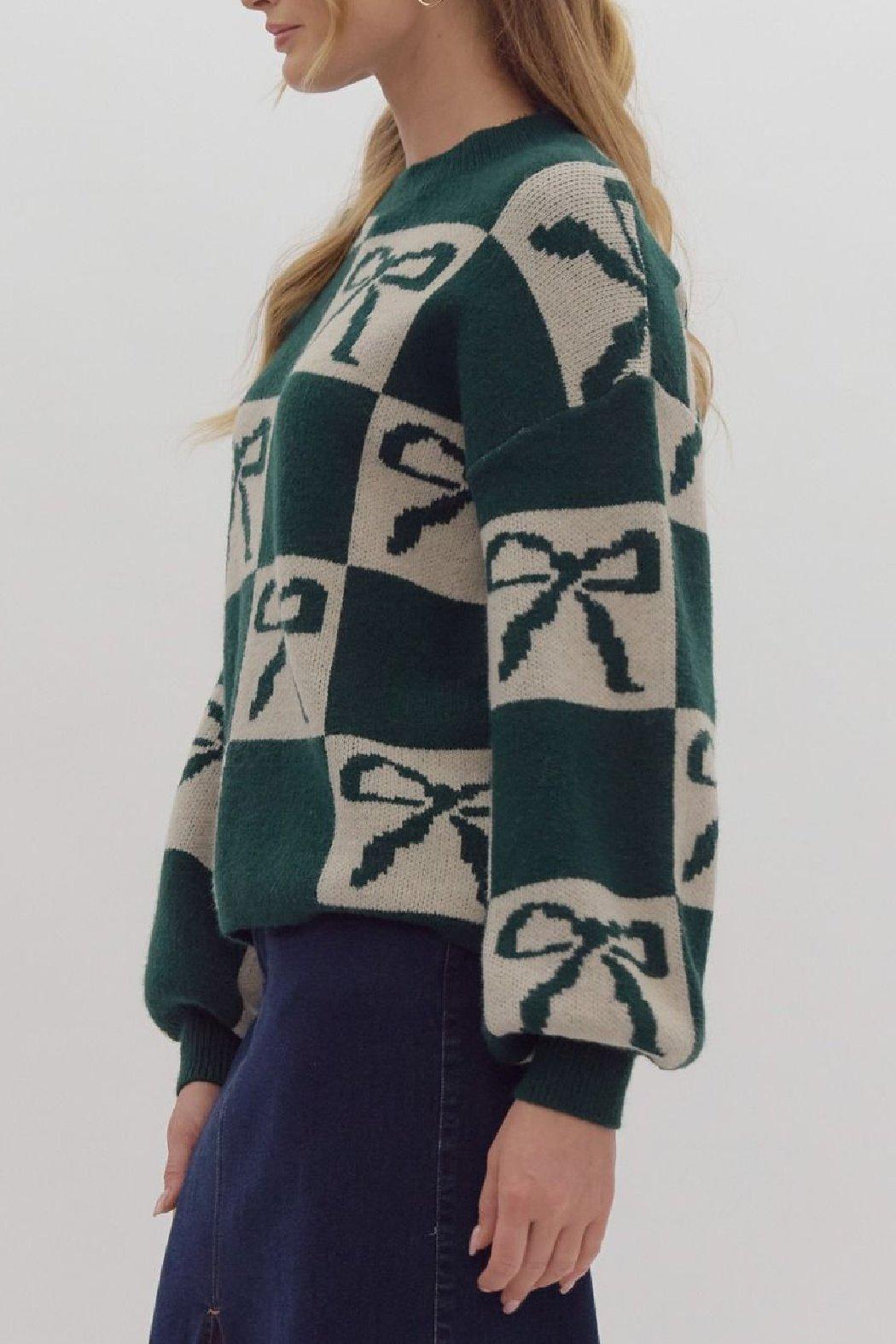 Pullover, slightly lighter weight sweater has a color blocked bow print throughout. It has a looser, oversized sleeve with a ribbed cuff at the wrist. It's a soft, comfortable option for the Holiday season that can be paired with denim or a skirt.