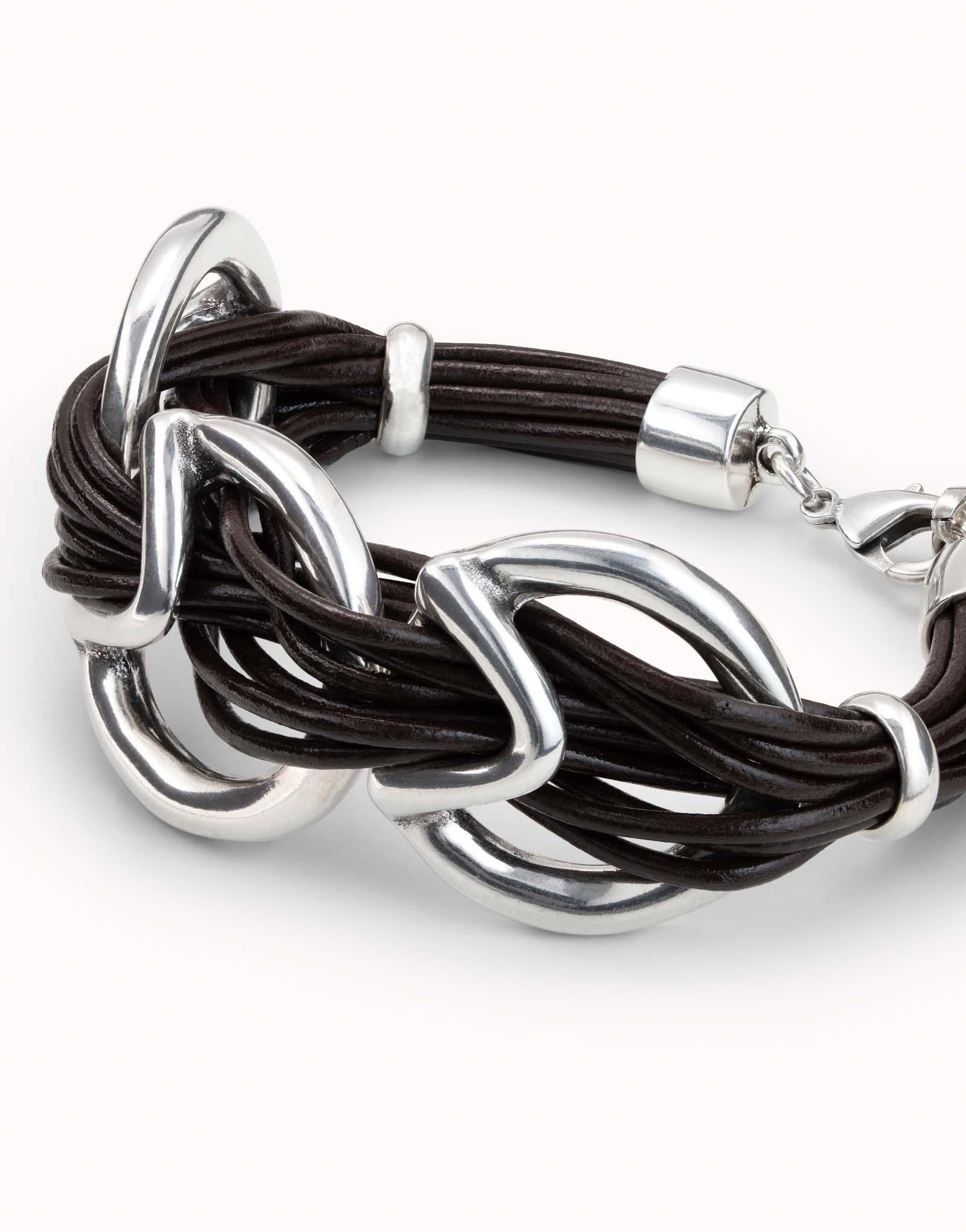 Exceptional bracelet with a modern and simple style, composed of beautiful intertwined leather straps with large silver-plated metal round and triangular-shaped Glow. It has a traditional lobster clasp that can be easily opened. This jewelry is handmade in Spain.
