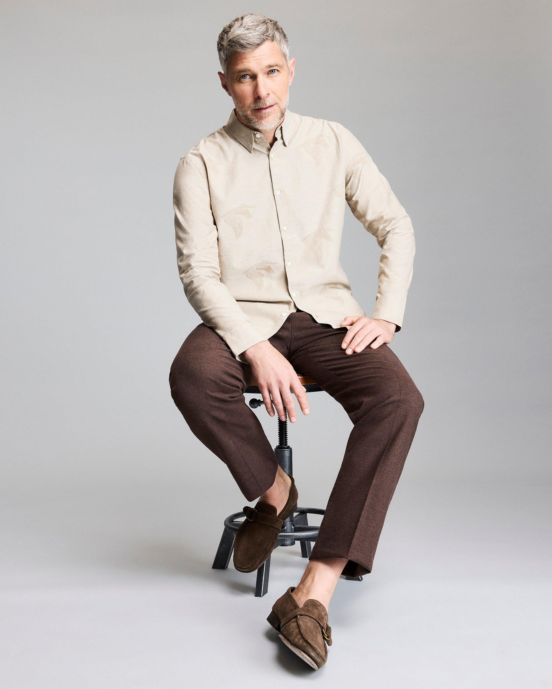 This woven shirt has the same structure and silhouette as our classic Wilson Shirt details, but features a custom pelican melange jacquard by Billy's friend, the artist Bradley Gordon. The result is a style that looks great worn on its own with jeans or worn with a jacket or trousers for an elevated take on a casual lo