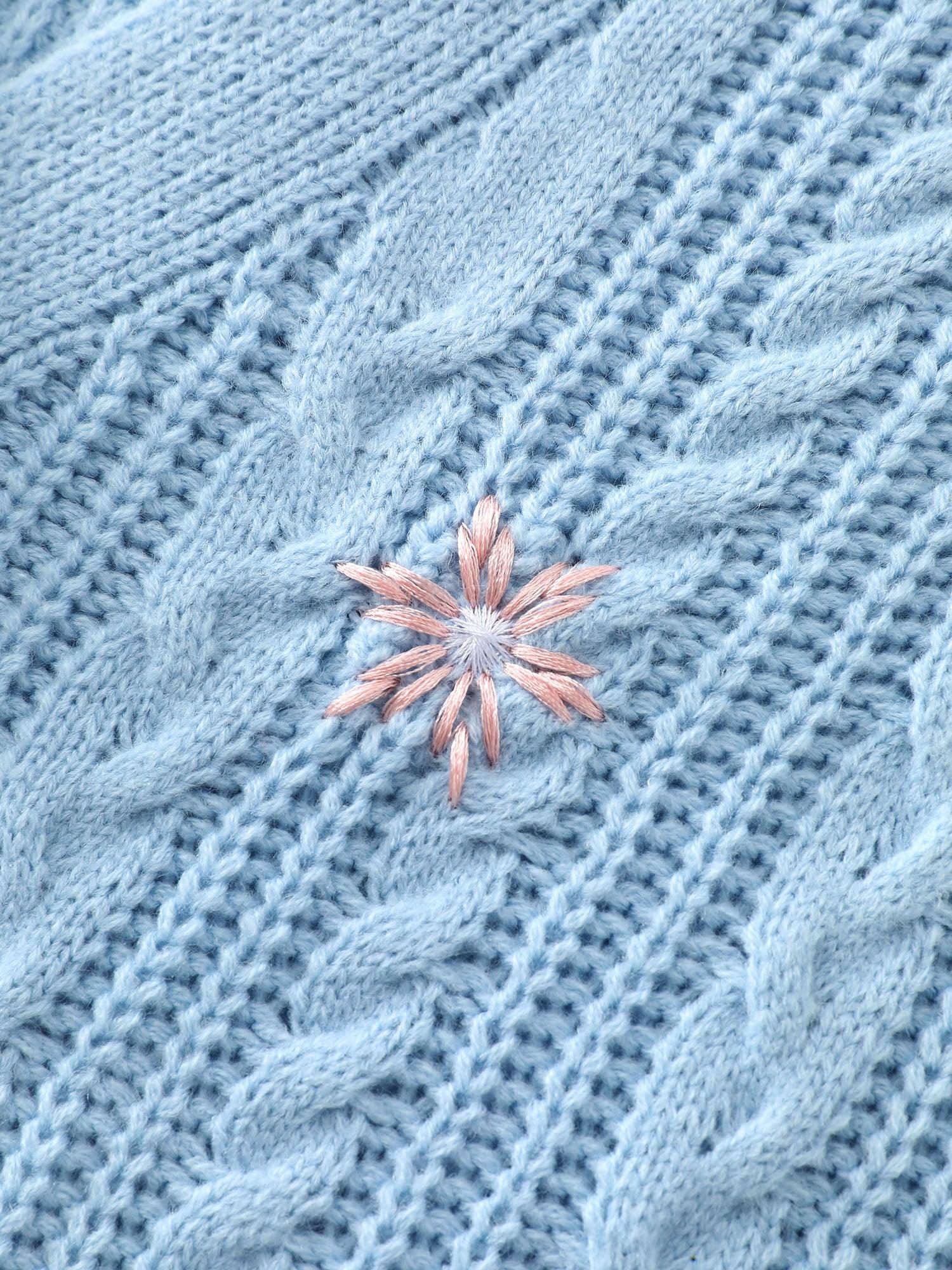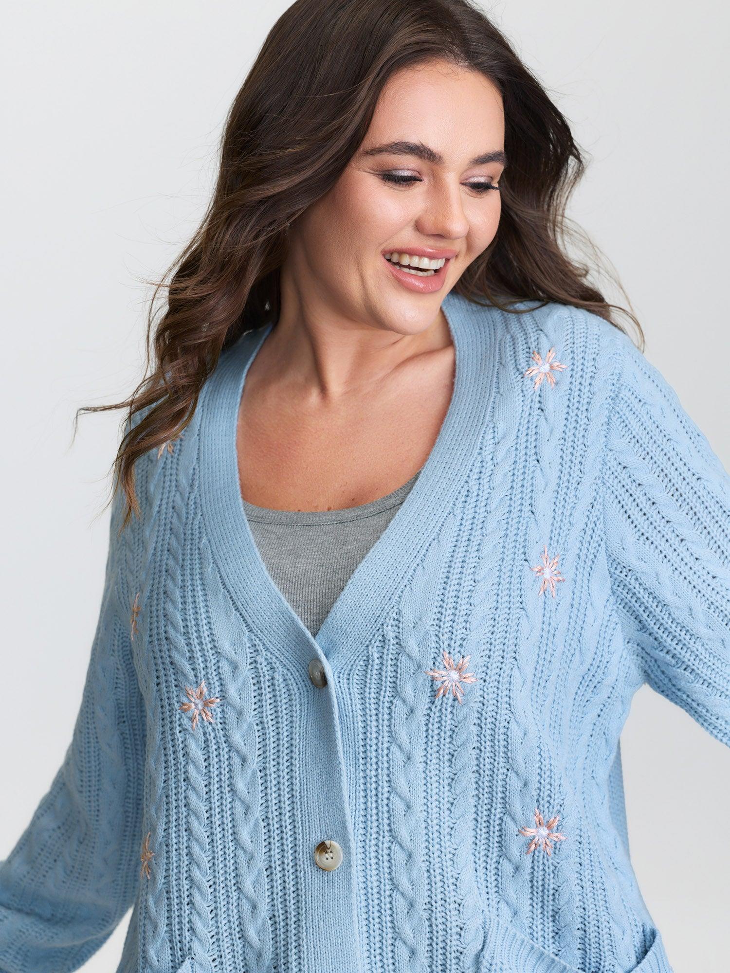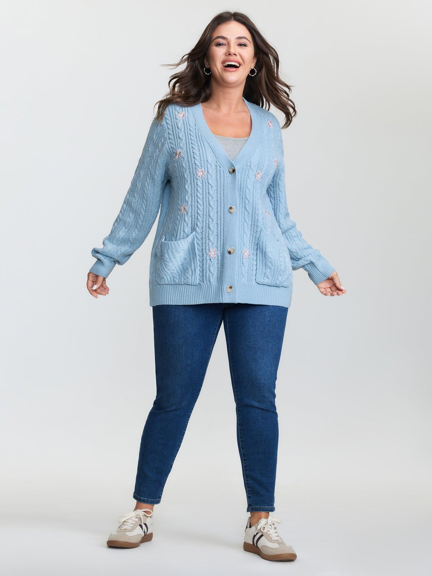 Shop Braided Texture Floral Embroidery Knit Cardigan now and redefine your style with confidence at BloomChic. Tailored for mid and plus-size women. This trendy Sweaters Cardigans Women, sizes 10-30. Color:LightBlue;Style:Playful;Neckline:Deep V-neck;Sleeve Type:Regular Sleeve;Prints:Floral;Details:Embroidered;Pocket:Patch pocket;Belt:No-belt;Closure Type:Button