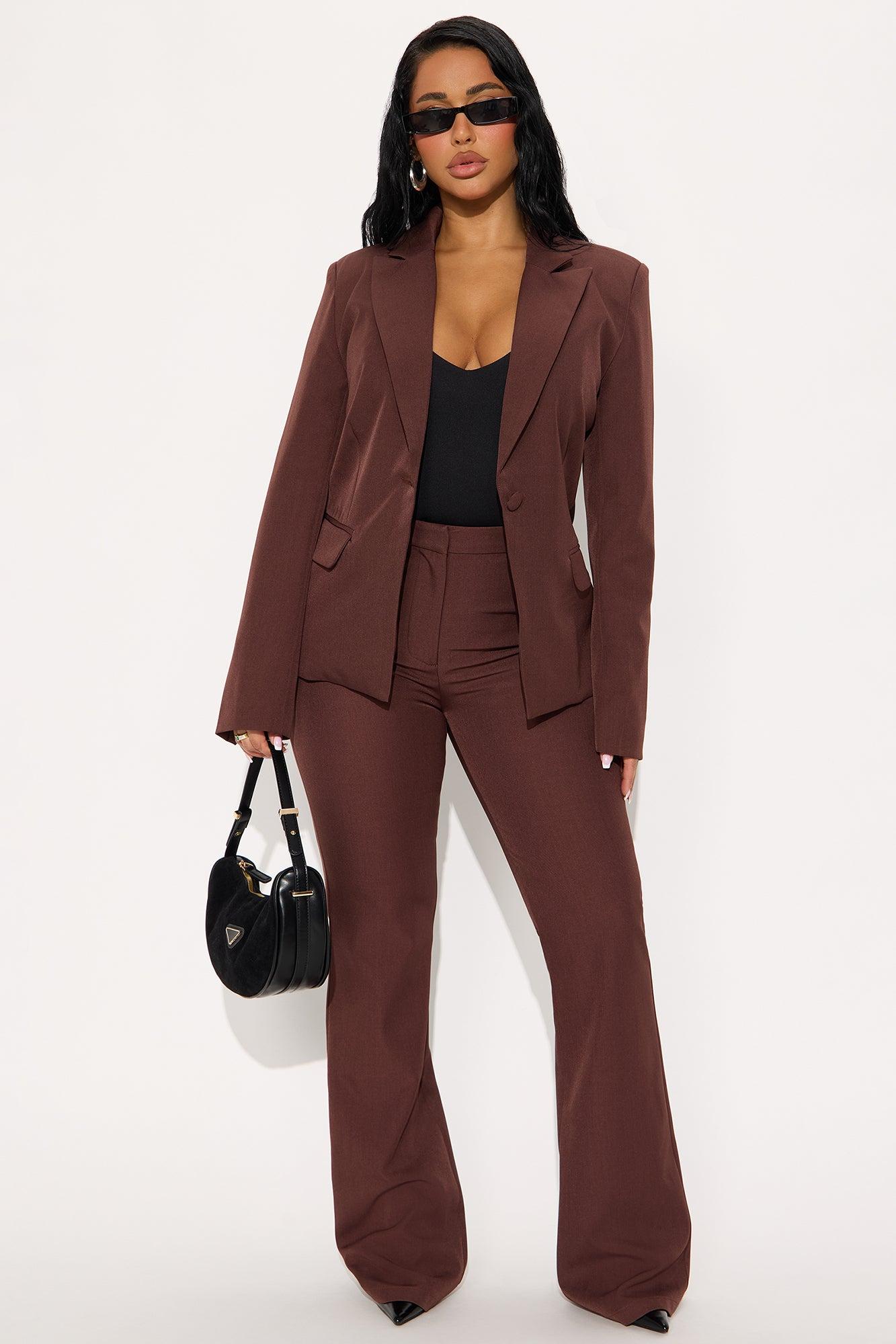 Available In Black, Chartreuse, Chestnut, Chocolate, Cream, Grey, Navy, Pink, Raspberry, Red, Royal And Slate Blue. Blazer Lapel Collar Long Sleeve Button Closure Pockets Fully Lined Pair With "Breaking Even Flare Trouser" Shell: 96% Polyester 4% Spandex Lining: 100% Polyester Imported