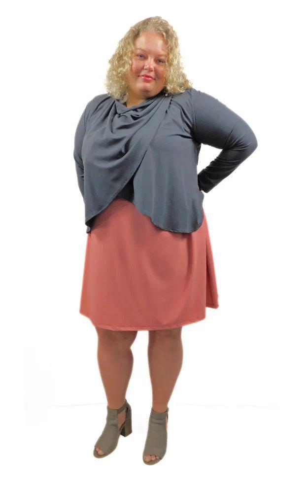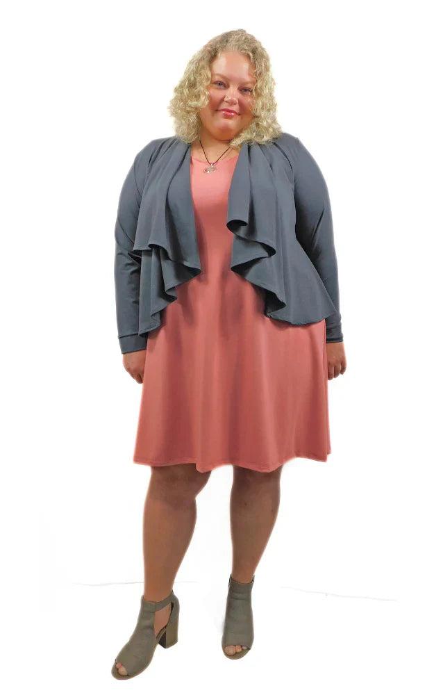 This short cardigan wrap drapes beautifully when worn open at the front. The front panel is wide enough to gather and pin at the shoulder with your favourite brooch. Seen worn here with matching sleeveless dress and black panel skirt.