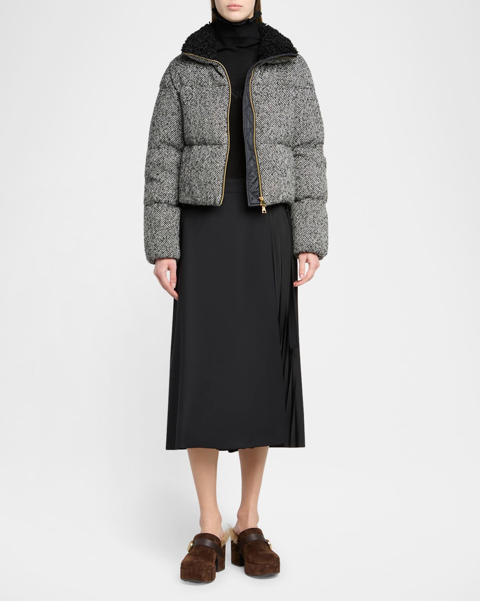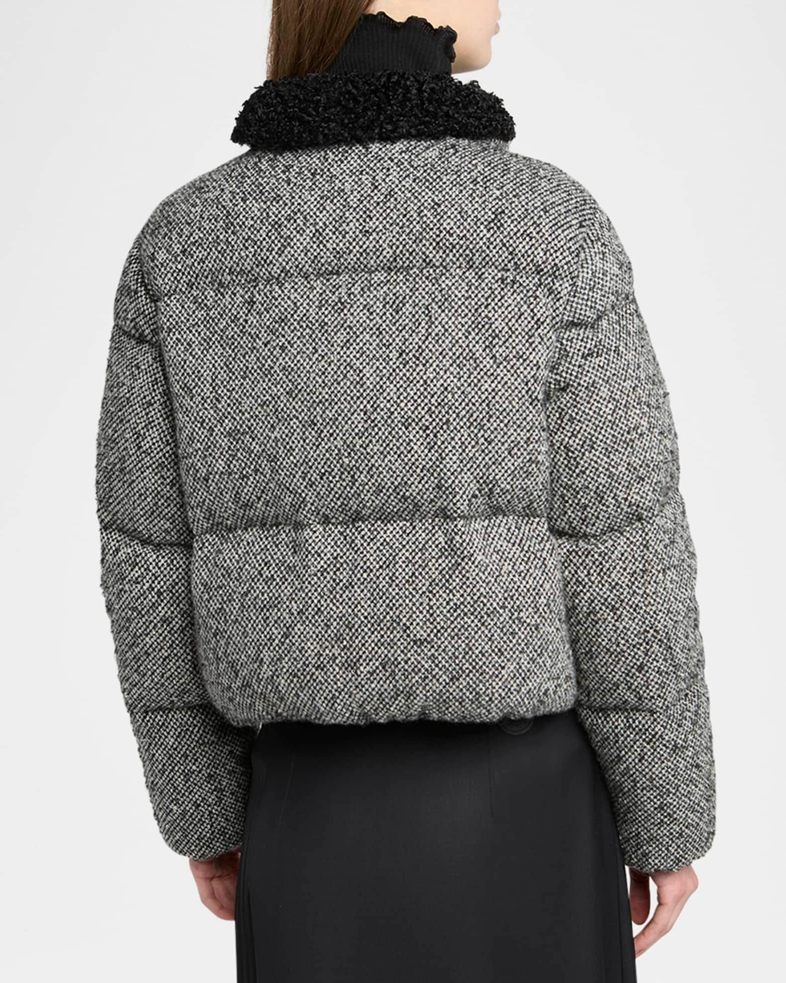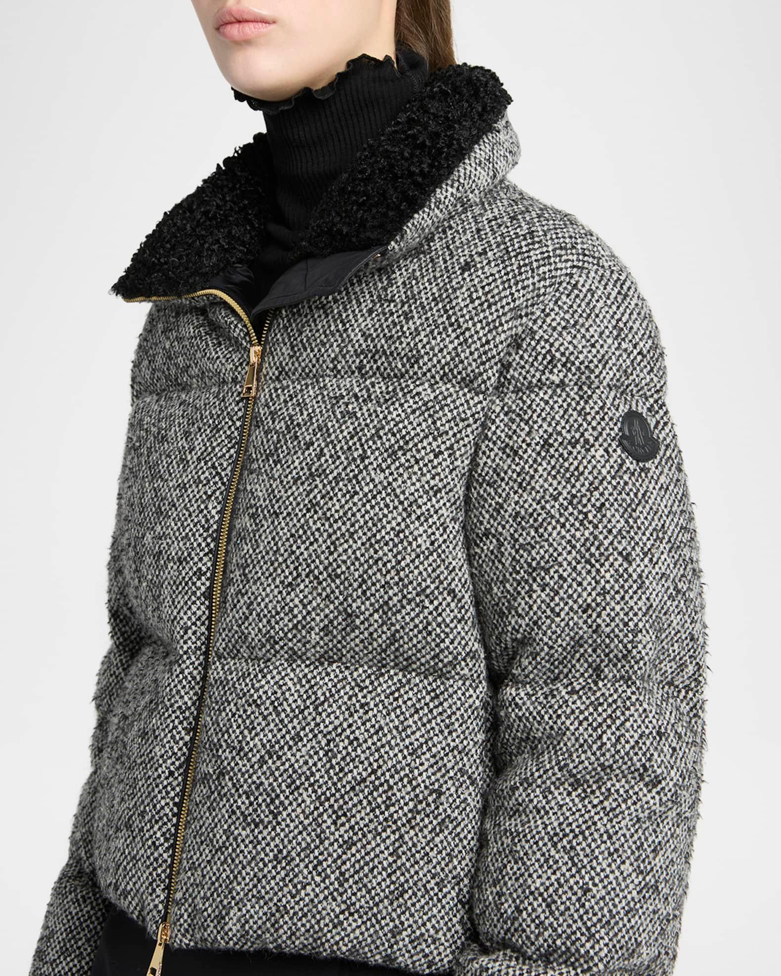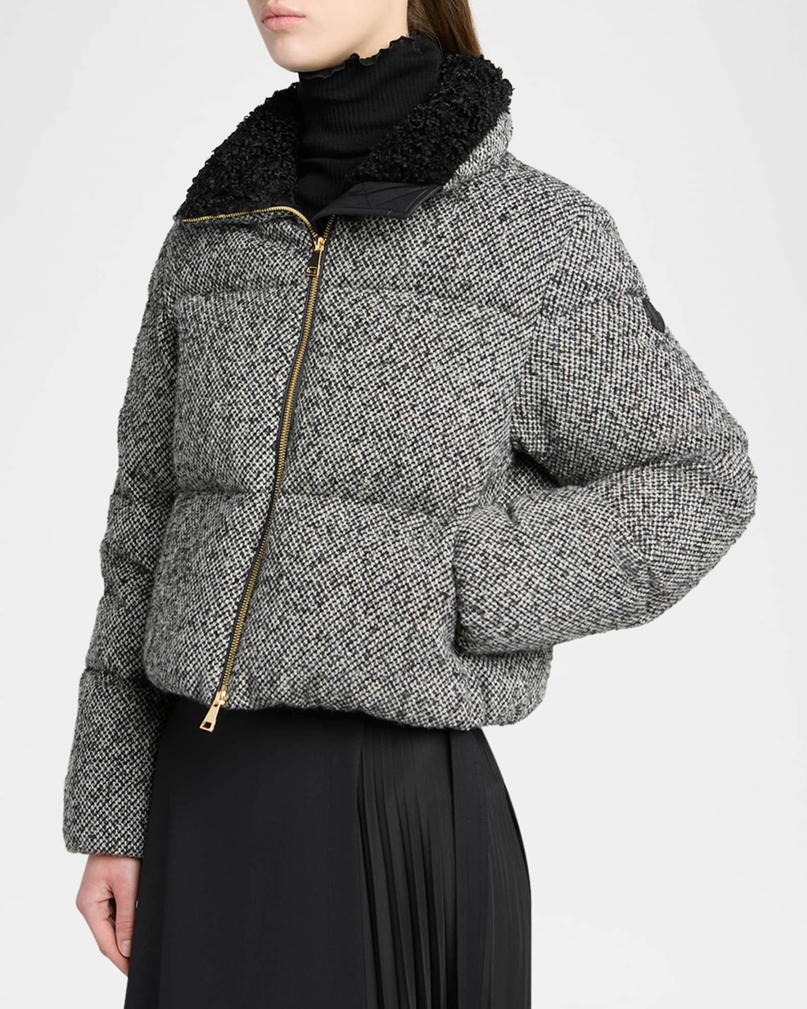 Moncler "Brezesse" wool-blend short jacket enhanced with faux shearling lining and gold-tone hardware Stand collar Long sleeves Features leather logo patch on left sleeve Classic fit Hem sits at the hip Two-way zip-front Wool/nylon/polyamide/lyocell Fill: Down/feather Lining: Nylon/polyester Professional cleaning recommended Imported