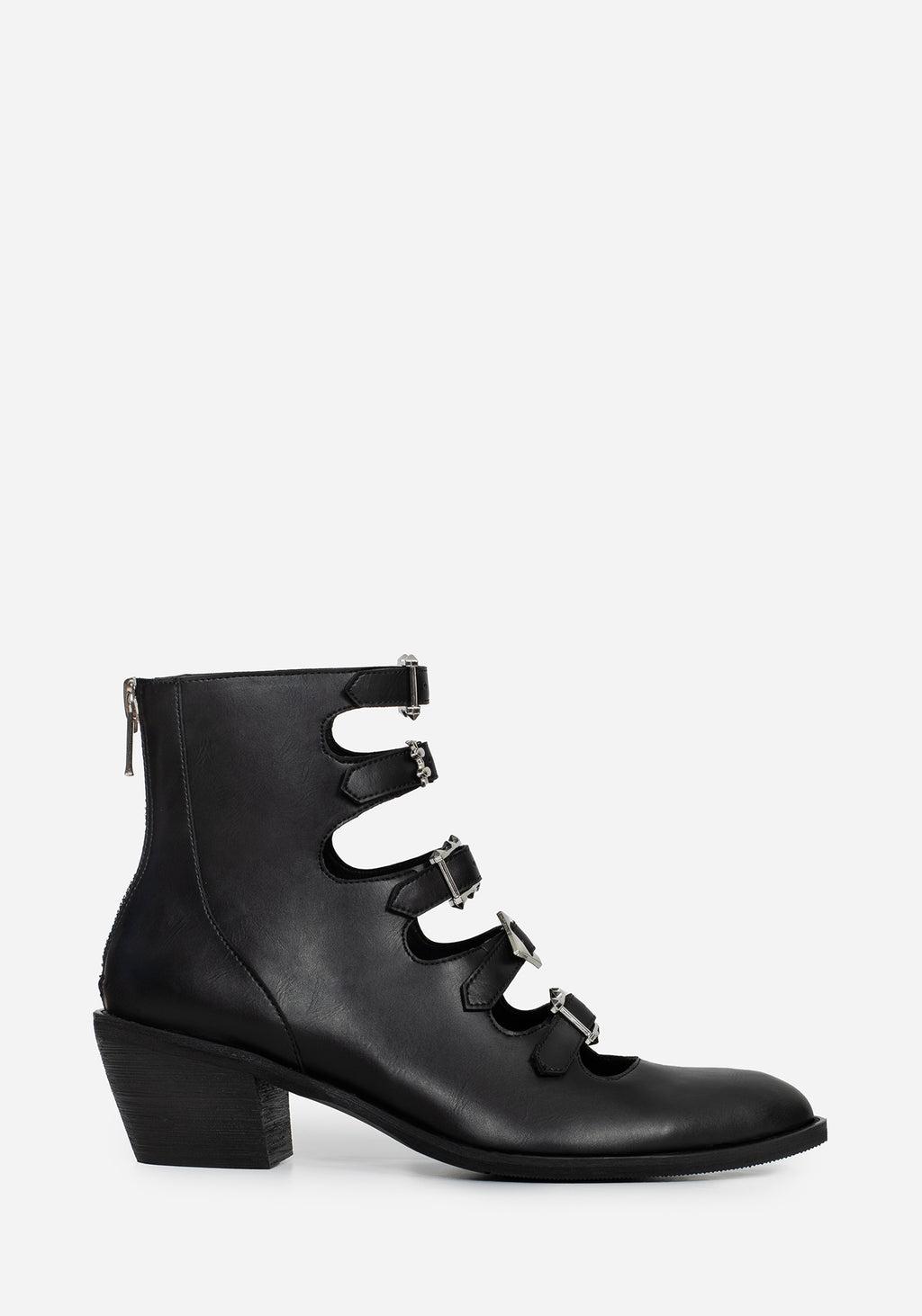 Stand like Druids of eld, with voices sad and prophetic...✦ Buckled pointed ankle boots ✦ Slanted heel gives a witchy silhouette ✦ Silver heel zip for no-nonsense dressing ✦ Functional mismatched silver buckles – adjust to your liking ✦ Sturdy faux leather✦ Nought but tradition remains✦ 100% false leather✦Measurements:Heel height: 5.5cm