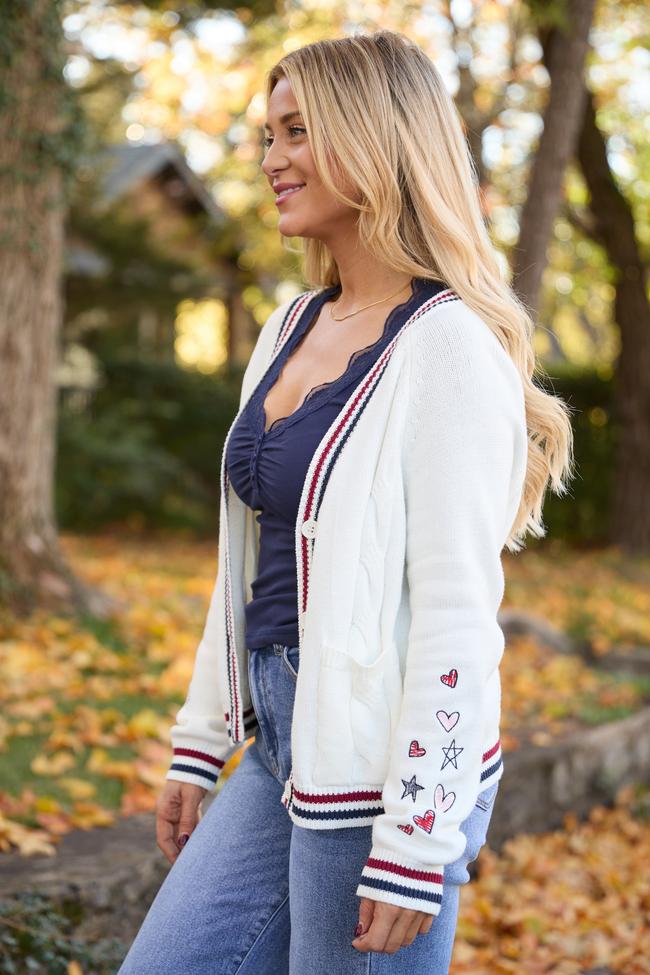 Details Striped Trim Varsity Long Sleeve Cardigan Fabric has stretch V-neckline Lined border Functional pockets Functional button up closure Unlined Material and Care 60% cotton 40% acrylic Machine wash cold, line dry Size and Fit Size Small approximate measurements. Bust: 40" Length: 20.5"