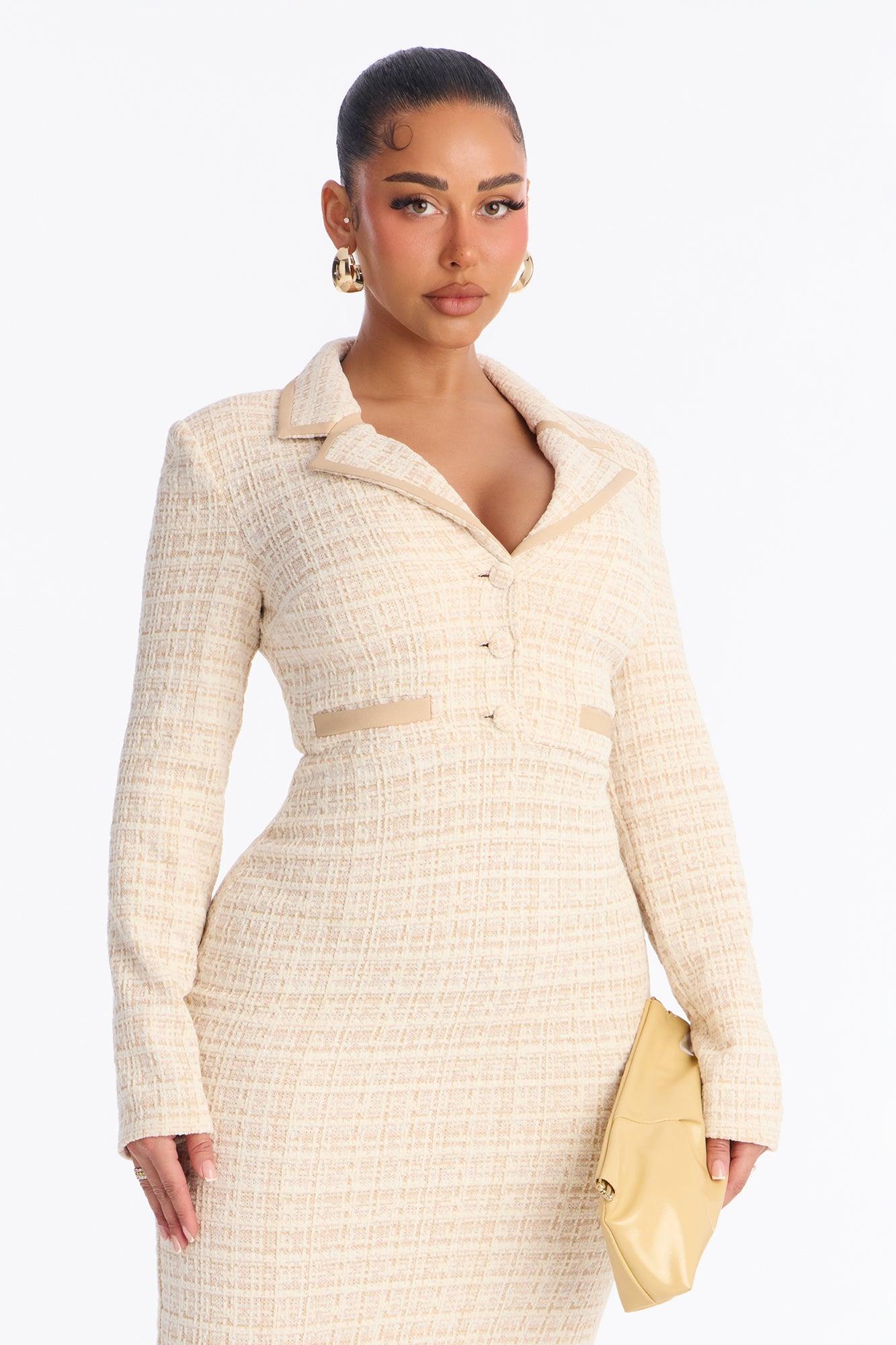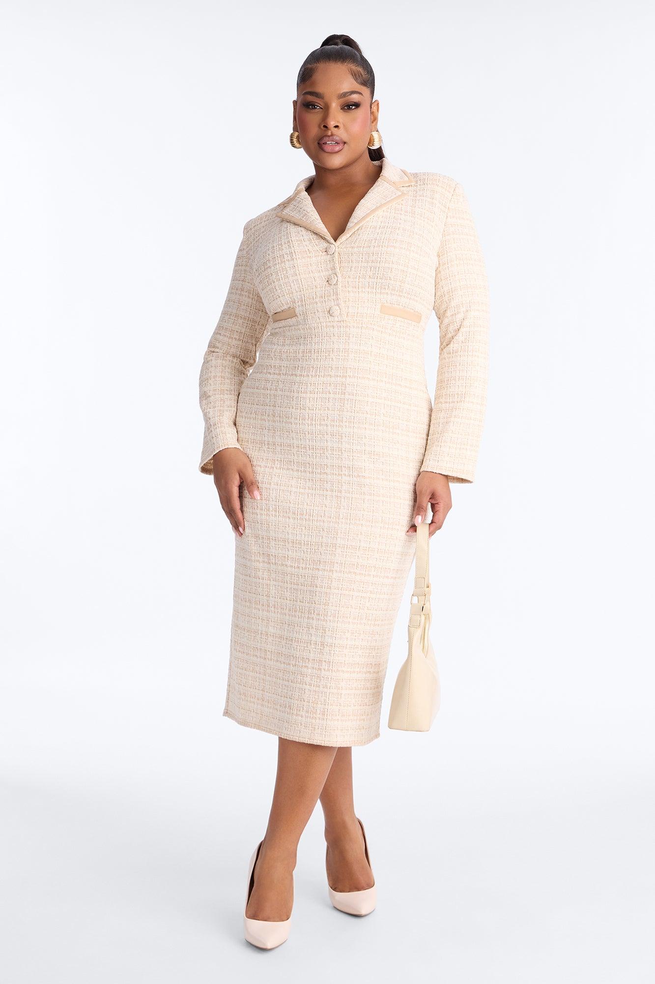 Available In Mauve. Tweed Midi Dress Collar Long Sleeve Shoulder Pads Button Up Zipper Stretch Length Measured Flat = 47" Self : 70% Polyester 25% Cotton 5% Spandex Contrast : 95% Polyester 5% Spandex Imported California Proposition 65WARNING: Cancer and Reproductive Harm - www.P65Warnings.ca.gov.