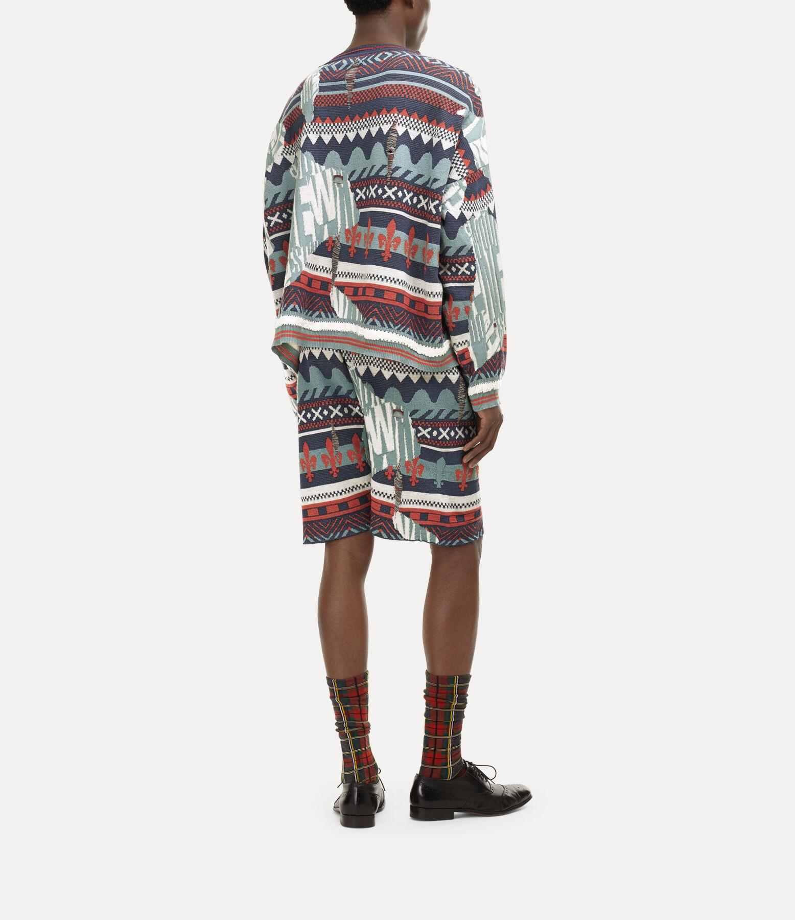 The Broken Fair Isle jumper features this season's Fair Isle jacquard, incorporating signature iconography of the house and faded sections where the classic 'Vivienne Westwood' lettering motif subtly appears. The piece offers distressed details, including sporadically placed holes, to create the illusion of a deconstructed, worn-in effect.