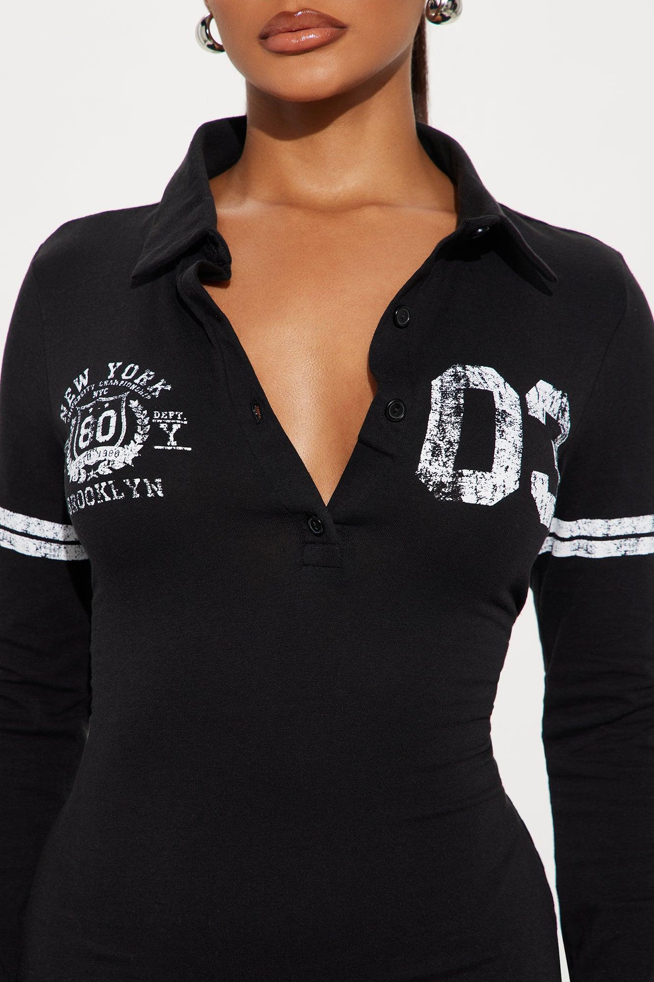 Available In Black. Polo Micro Mini Dress Collar neckline Long sleeves Graphic Stretch Length measured flat = 30" Disclaimer: Due To The Screen Printing Process A Difference In Saturation May Occur. Each Garment Is Unique. Self: 95% Cotton 5% Spandex Imported California Proposition 65WARNING: Cancer and Reproductive Harm - www.P65Warnings.ca.gov.