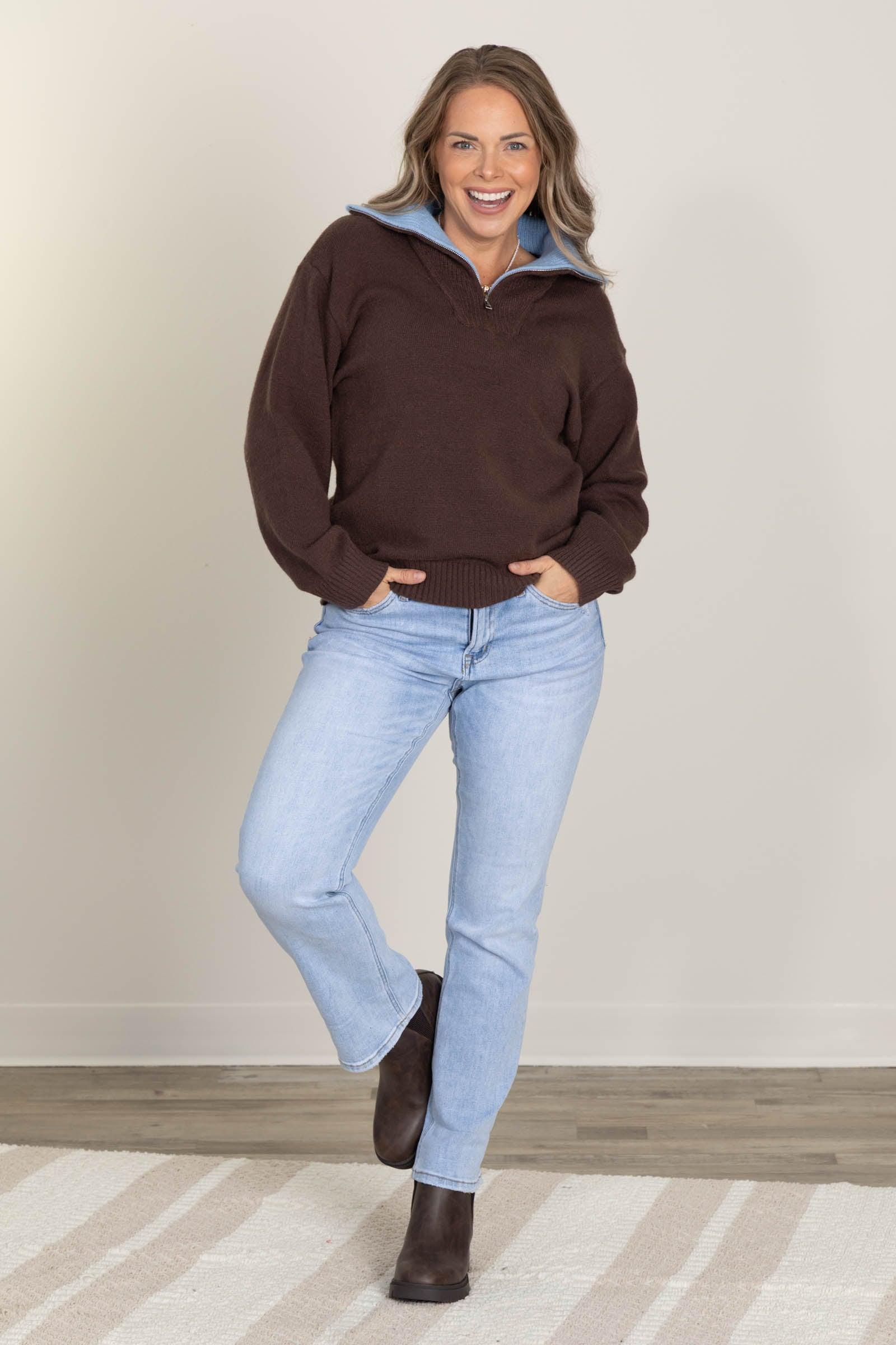 Product Details Colors: Brown/ Baby Blue Print: Two Tone Neckline: 3/4 Zip Sleeve: Long Sleeve Hemline: Straight Brand: Jodifl Material and Care 65% Acrylic 20% Polyamide 15% Polyester Hand Wash Cold Hang/ Line Dry Size and Fit Small: Bust 40" Waist 38" Length 24" Medium: Bust 42" Waist 40" Length 24.5" Large: Bust 44" Waist 42" Length 25" Erica is 5’7” and wearing her true size small