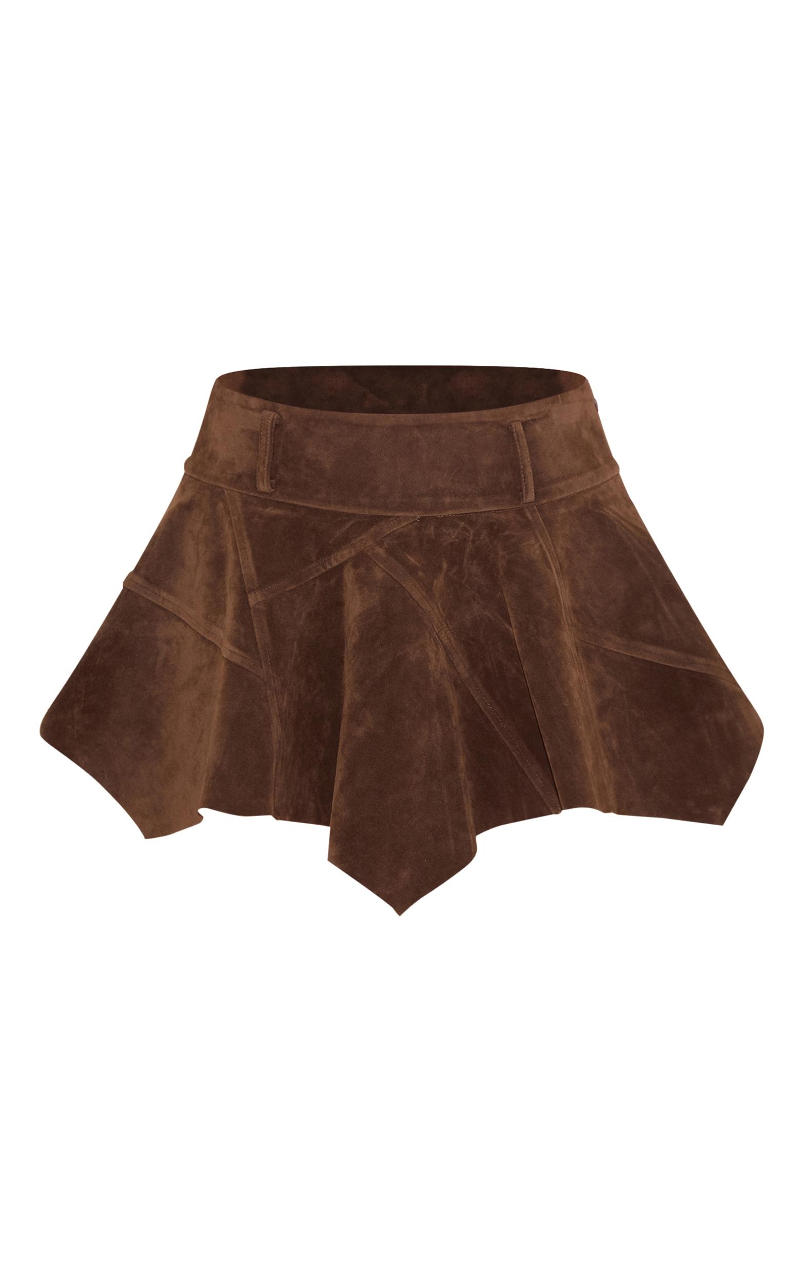Capture every gaze with a skirt that moves with purpose. The brown faux suede hanky hem mini skirt defines a new kind of evening allure, with its unique hanky hem and chic mini length creating an artful silhouette that stands out. Structured and distinctive, the brown faux suede features intricate panel detailing, adding depth to its design. For a confident evening aesthetic, pair this distinctive piece with a crisp fitted knit or a sharp camisole, completing the look with sleek high heels and a compact clutch. This essential elevates any after-dark ensemble with effortless edge.Length approx 33cm/13inch (Based on sample size US 4)Model wears size UK 8/ EU 36/ AUS 8/ US 4Model Height - 5ft 7inchp]:!mb-4inch>Brand: PrettyLittleThingCategory: BottomsProduct type: Mini SkirtColor: BrownMaterial: Faux SuedeDesign: PlainOccasion: Evening