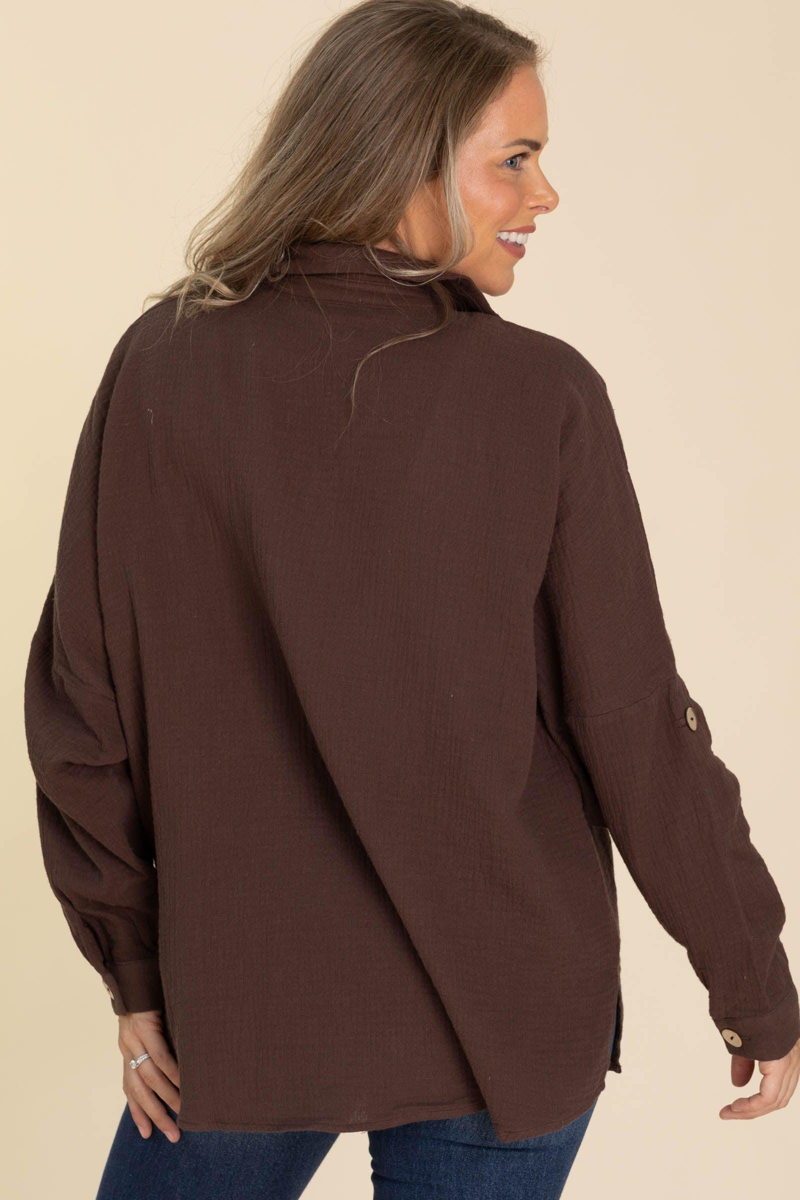 Product Details Colors: Brown Print: Gauzy Solid Neckline: V-Neck Button Down Sleeve: Long Sleeve Hemline: Straight Brand: P.S. Kate Material and Care 100% Rayon Hand Wash Cold Hang/Line Dry Size and Fit Small: Bust 52" Waist 50" Length 28" Medium: Bust 54" Waist 52" Length 28.5" Large: Bust 56" Waist 54" Length 29" 1XL: Bust 58" Waist 56" Length 29.5" 2XL: Bust 60" Waist 58" Length 30" 3XL: Bust 62" Waist 60" Length 30.5" Sarah is 5’8” and wearing her true size small Erica is 5’7” and wearing her true size small