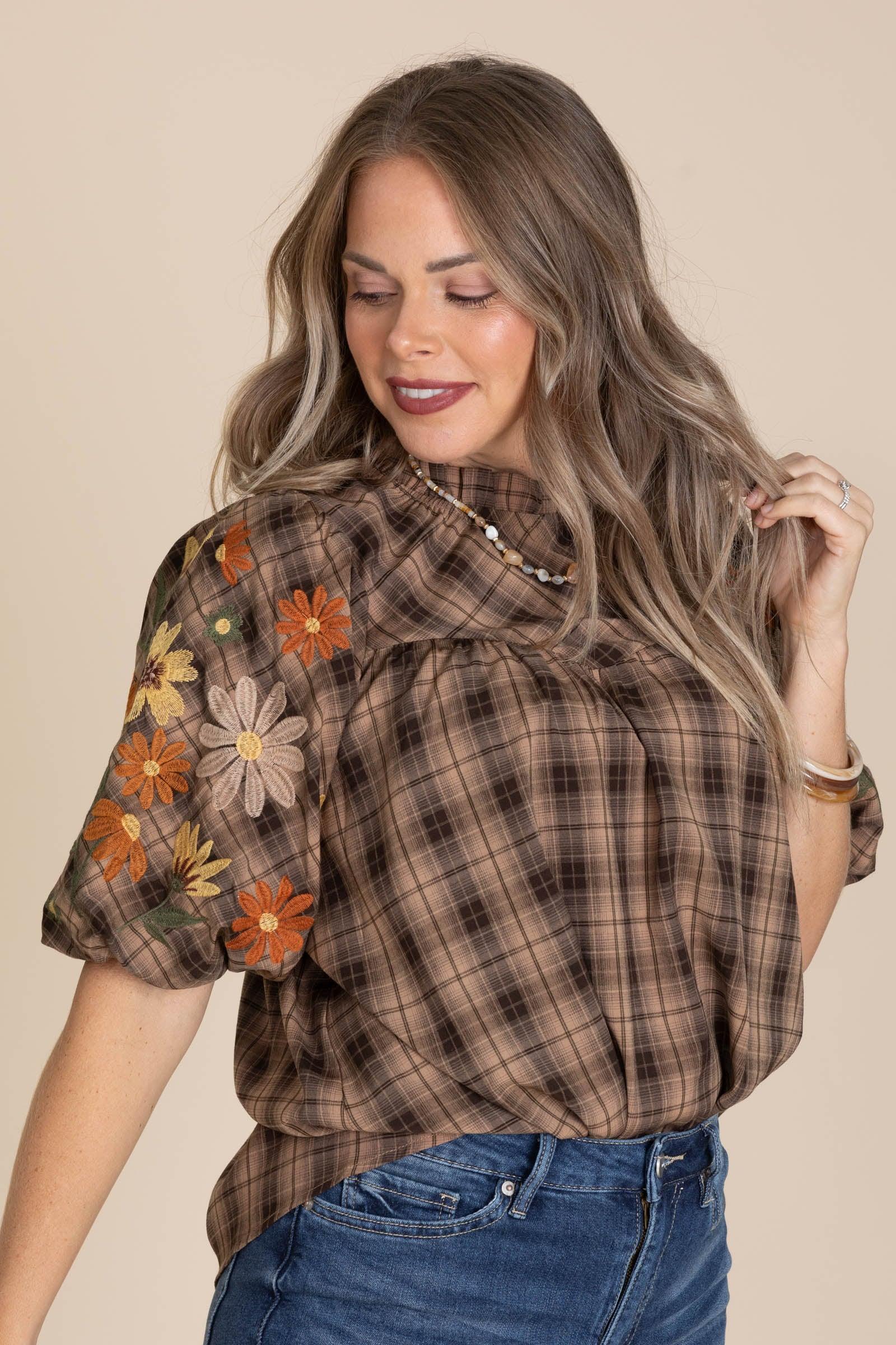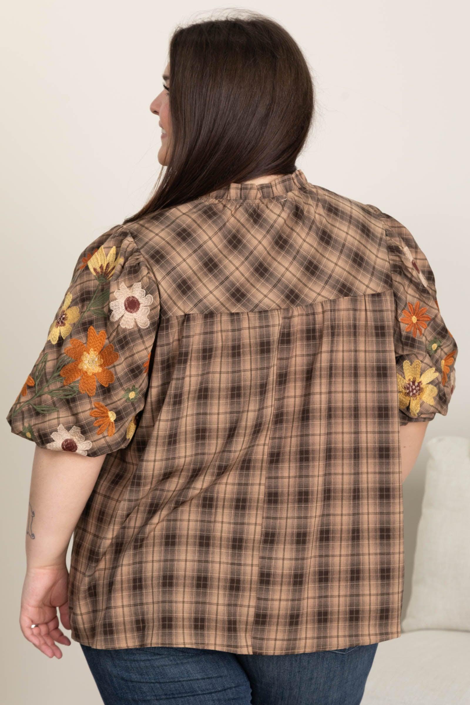 Product Details Colors: Brown, Mocha, Dark Orange, Olive, Marigold, Beige, Burgundy Print: Plaid/ Floral Neckline: Mock Sleeve: 3/4 Sleeve Hemline: Straight Brand: Oddi Material and Care Self:84% Polyester 11% Rayon 5% Spandex Lining: 100% Polyester Hand Wash Cold Hang/ Line Dry Size and Fit Small: Bust 42" Waist 46" Length 25" Medium: Bust 44" Waist 48" Length 25.5" Large: Bust 46" Waist 50" Length 26" 1X Large: Bust 50" Waist 52" Length 26.5" 2X Large: Bust 52" Waist 54" Length 27" 3X Large: Bust 54" Waist 58" Length 28.5" Erica is 5’7” and wearing her true size small Kristen is 5’2 and wearing her true size X Large