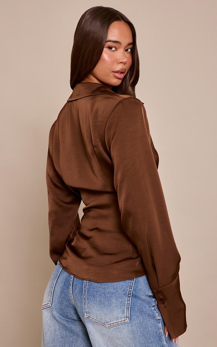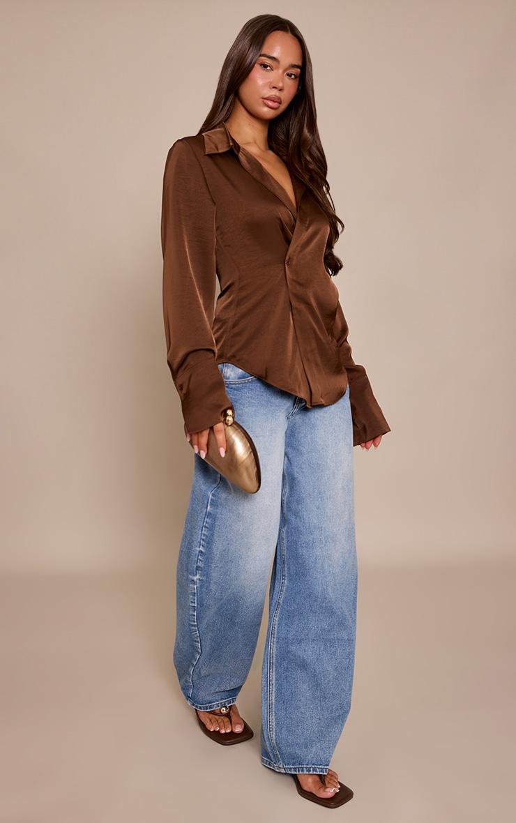 Channel modern elegance with the brown satin asymmetric button shirt. It features a confident collared neckline and a single asymmetric button fastening. This piece sets the tone for memorable evening occasions. Team with tailored pants, sleek chunky boots, and a black bag.Length approx 48.5cm/19inch (Based on sample size US 4)Model wears size UK 8/ EU 36/ AUS 8/ US 4Model Height - 5ft 8inchp]:!mb-4inch>Brand: PrettyLittleThingCategory: TopsProduct type: ShirtColor: BrownMaterial: SatinOccasion: Evening