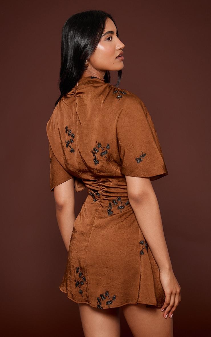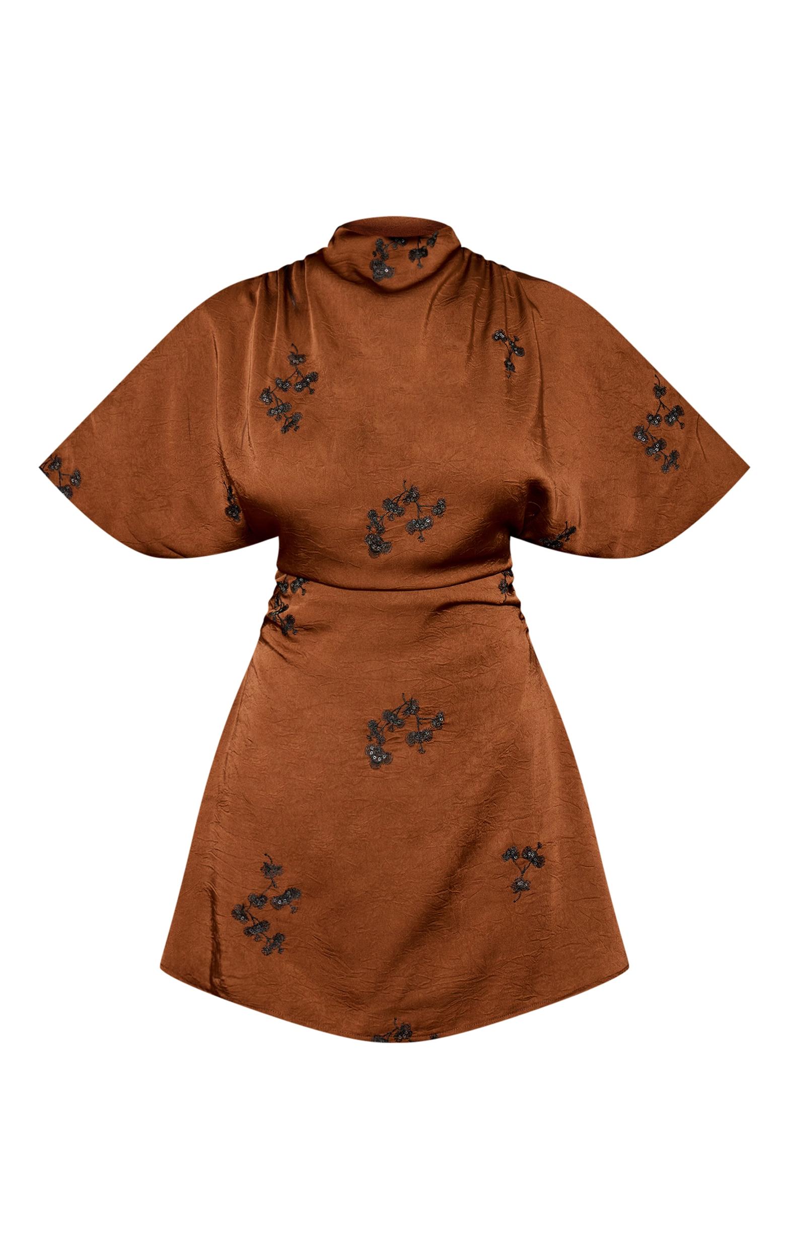 Make a confident statement with the brown satin embroidered mini dress. This brown satin-look shift dress features a refined high neck, chic short sleeves, and intricate black embroidery throughout its mini silhouette. This piece is ideal for those captivating evening plans where you want to make an impact. Pair yours with chic small heels and a matching black bag for an effortlessly put-together look.Length approx 81.5cm/32inch (Based on sample size US 4)Model wears size UK 8/ EU 36/ AUS 8/ US 4Model Height - 5ft 9inchp]:!mb-4inch>Brand: PrettyLittleThingCategory: DressesProduct type: Shift DressColor: BrownMaterial: Woven CrepeOccasion: Evening