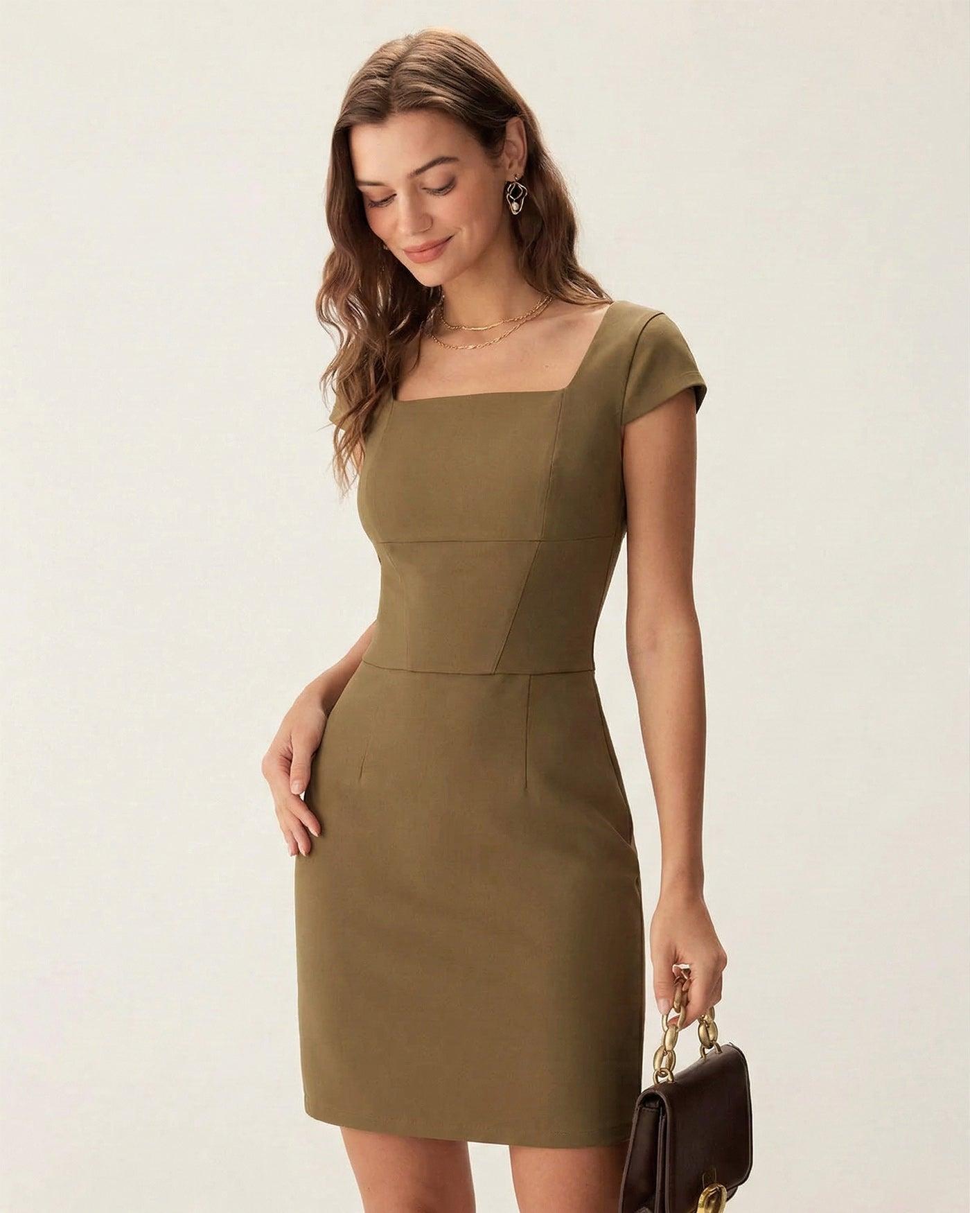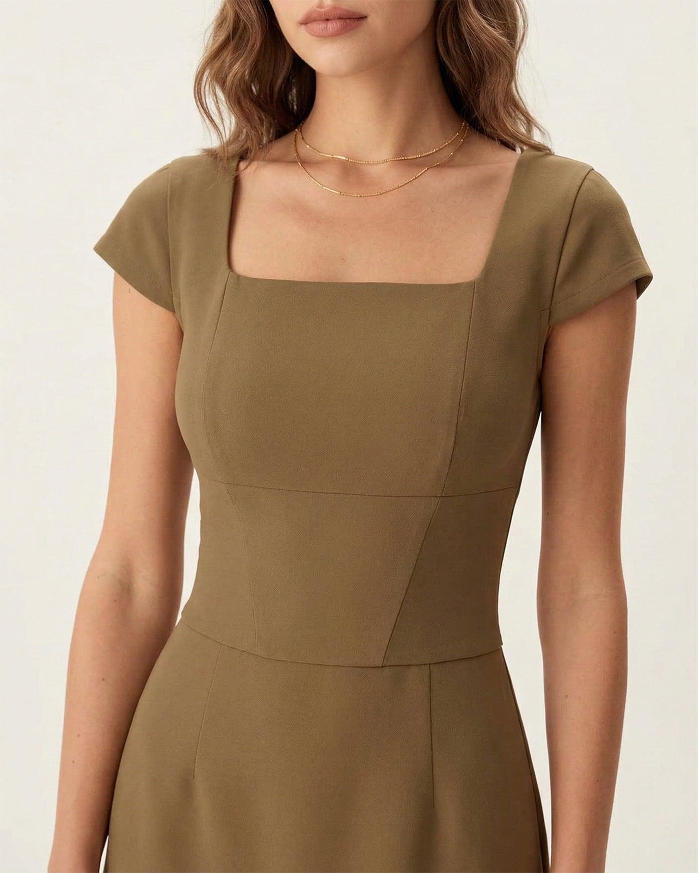 - Occasion: Office wear - Style: work - Fabric Stretch: No Stretch - Waist: Natural Waisted - Sleeve Length: Short Sleeves - Sleeve Type: Cap Sleeve - Pattern Type: Solid - Embellishment: Ruched, Slit - Neckline: Square Neck - Fabric: Polyester 75.0%, Viscose 18.0%, Spandex 7.0%