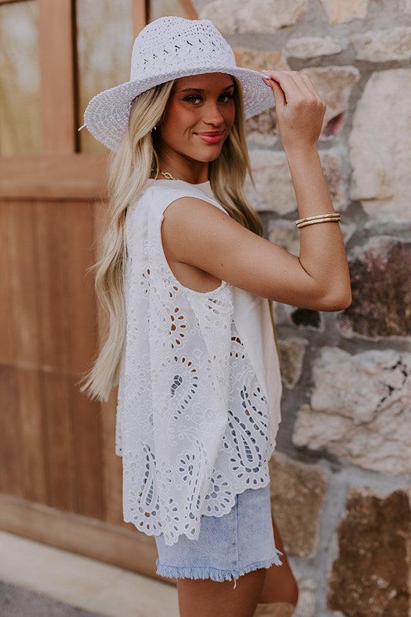 - Super cute and oh so stylish, this darling eyelet top is all about charming energy! From sun-soaked beaches to picnics in the park, this piece sweetens up any outfit. - A design featuring both knit and eyelet materials - Unlined - A crew cut neckline - Knit material on the front of the bodice - Pleated eyelet material on the back - A relaxed silhouette that ends in an uneven hemline