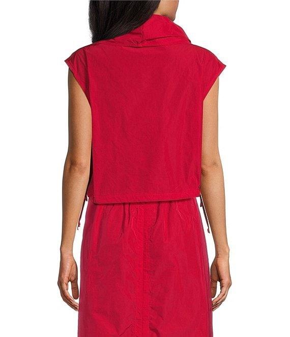 From Bryn Walker, this vest features: Memory crunch fabrication Cowl neckline Cap sleeves Asymmetrical hemline Adjustable self ties at hem Pullover construction Approx. 17" right front; 22" left front; 18" back length Polyester Machine wash Imported.
