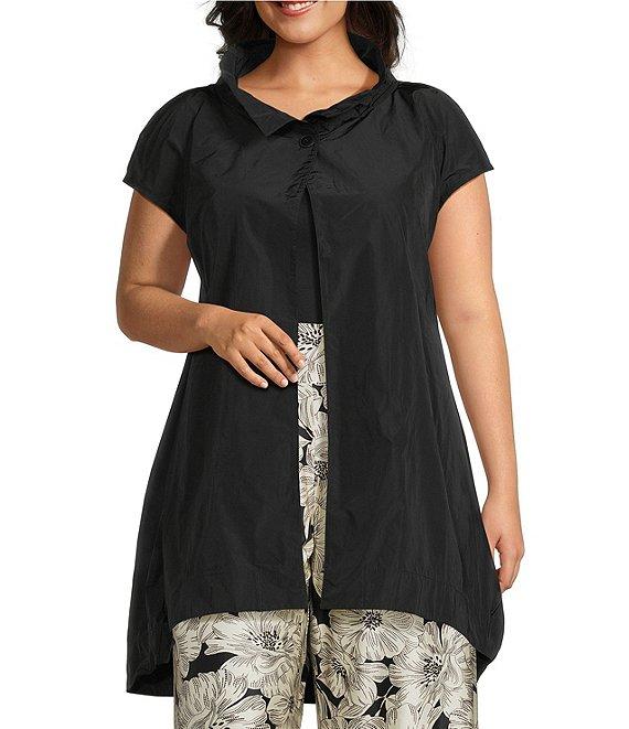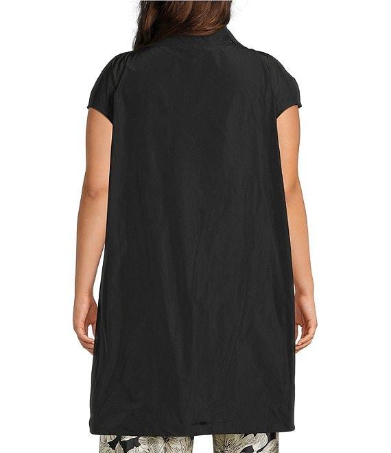 From Bryn Walker Plus, this vest features: Memory crunch fabrication A-line silhouette Mandarin collar neckline Cap sleeves High-low hem Relaxed fit 2-front button closure Approx. 40" length Polyester Machine wash/tumble dry low Made in the USA.
