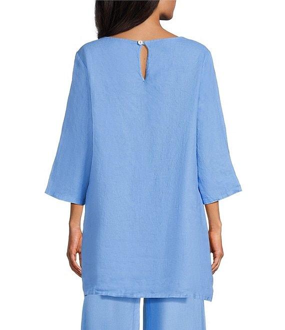 From Bryn Walker, this tunic features: Light linen fabrication Round neckline 3/4 sleeves Side pockets Straight hem Pullover construction Approx. 32.5" length Linen Machine wash Made in the USA.