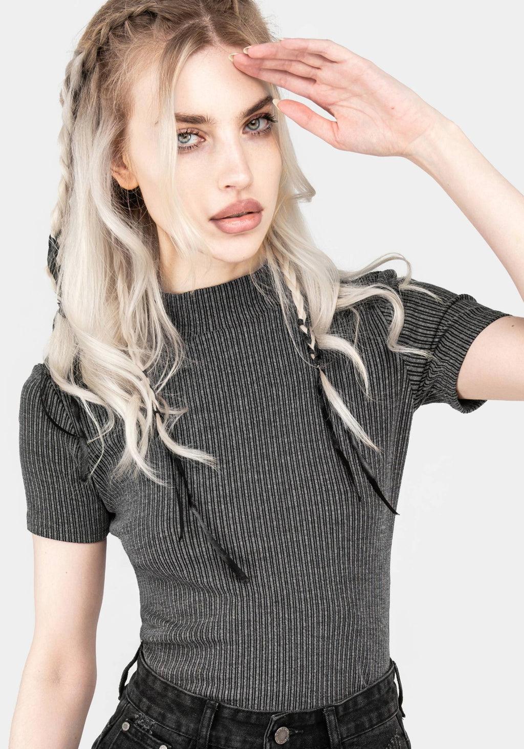 A little basic with an edge - Grey textured striped tee - Slim fit in a long crop length falls to the top of your waistband - High neck & short sleeves for layering potential - Soft & stretchy textured grey fabric with black stripes to add dimension - A perfect ‘fit foundation for layered looks 95% polyester, 5% elastaneAnna is 5'7" and wearing a UK8/ US4Brianne is 5’7” and wearing a UK8/ US4