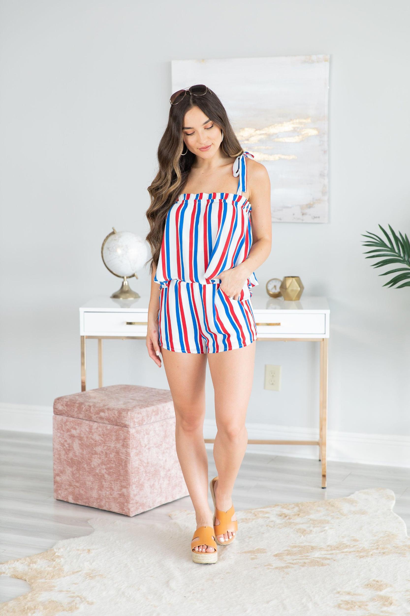 We have found the perfect pair of shorts for your 4th of July activities! They are so light and simple! The colors are clearly spot on for the holiday! Plus, we love that you can pair them with the available matching tank! Material has no amount of stretch.Savannah is wearing the x-small.