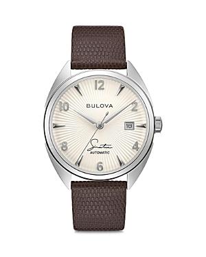 Incorporating vintage Bulova designs with the unmistakable elements of the legendary performer, Frank Sinatra, the ‘Fly Me To The Moon’ Watch features a stainless steel case with silver-tone vintage-style hands and markers. Frank Sinatra’s signature is displayed elegantly on the textured silver-white dial. The watch features a Miyota Caliber 8215 21-jewel automatic movement with a 42-hour power reserve and calendar. The exhibition case back showcases the fine movement and features the song title as well as the iconic Fedora Hat, which can also be found etched on the crown. The brown lizard grain textured leather strap features a deployment buckle and is stamped with the name ‘Fly Me To The Moon’ along the inside. The watch features a domed sapphire crystal with AR coating and water resistance to 30 meters. | Bulova Men's Frank Sinatra Fly Me To The Moon Watch