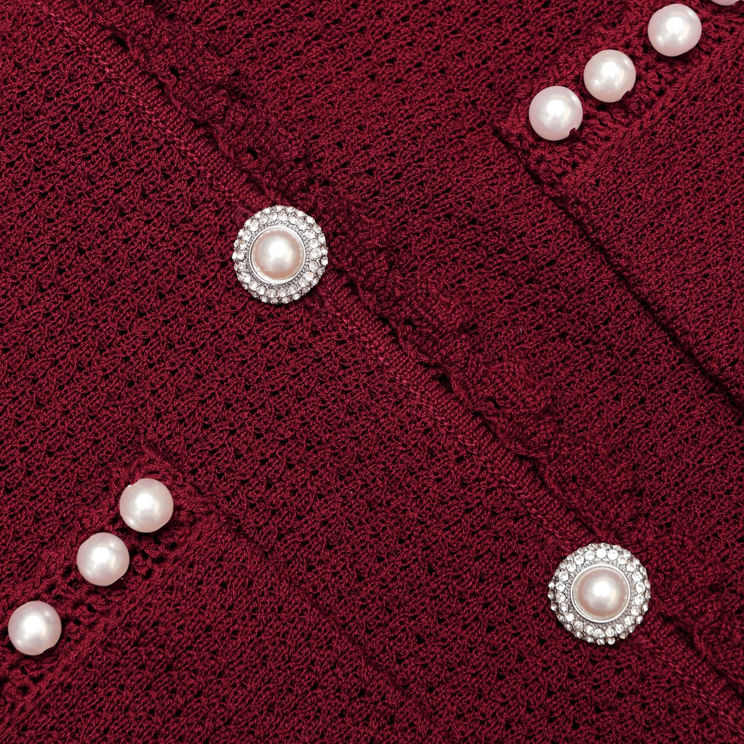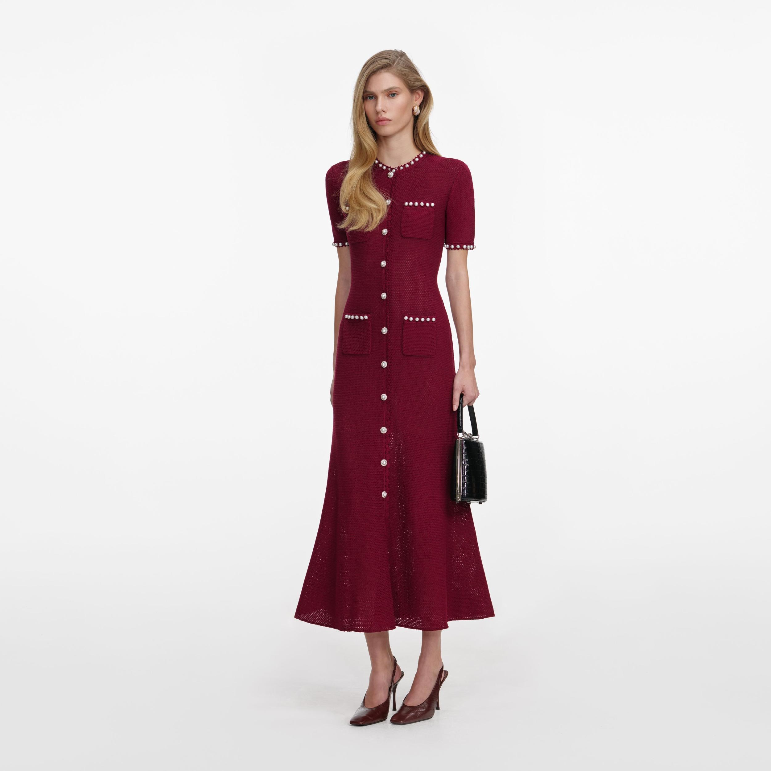 A no-brainer for work and play, faux pearl accents and rope trims add a luxurious touch to this burgundy knit midi dress. Pair with heels to show off its fit-and-flare silhouette for cocktail hour.True to sizeFabric has stretchButton closure down frontFaux pearl trimsFunctional pocketsModel is 5ft10/178cm and wears a size S