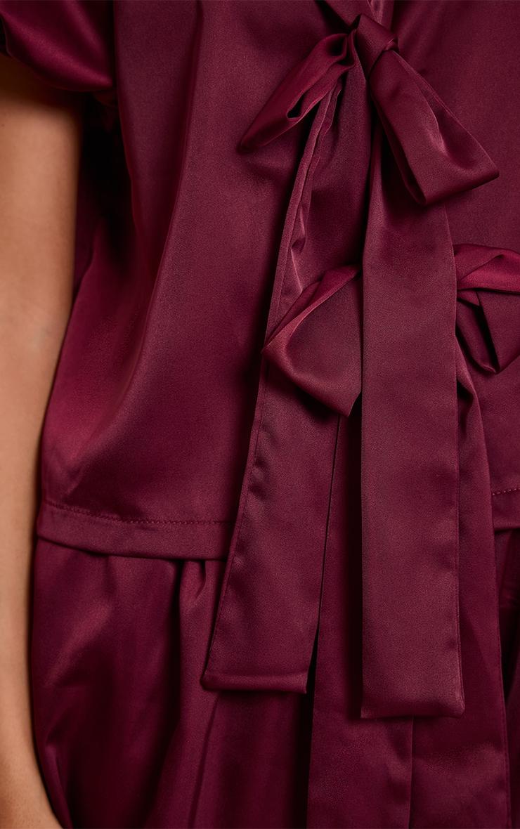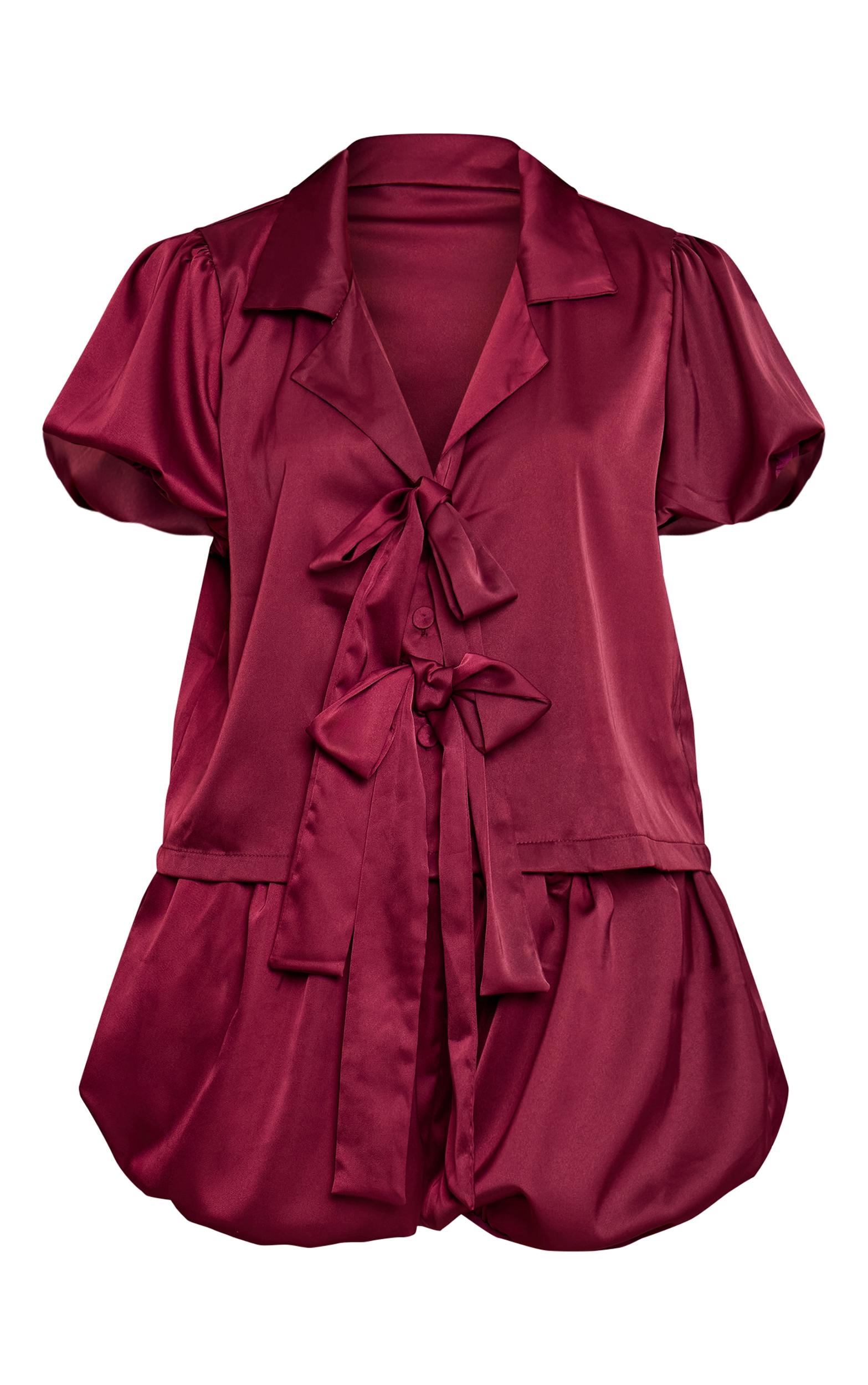 Unlock elevated ease with the burgundy puffball bow tie up short pyjamas. This burgundy set showcases a collared V-neckline with short puff sleeves, complemented by puffball shorts that tie at the waist. Perfect for those nights in, add slippers and a robe for a cosy look. Top length approx 48cm/19inch Bottoms length approx 33cm/13inch (Based on sample size S)Model wears size SModel Height - 5ft 7inchp]:!mb-4inch>Brand: PrettyLittleThingCategory: Lingerie & NightwearProduct type: Short PJ SetColor: BurgundyMaterial: SatinOccasion: Day
