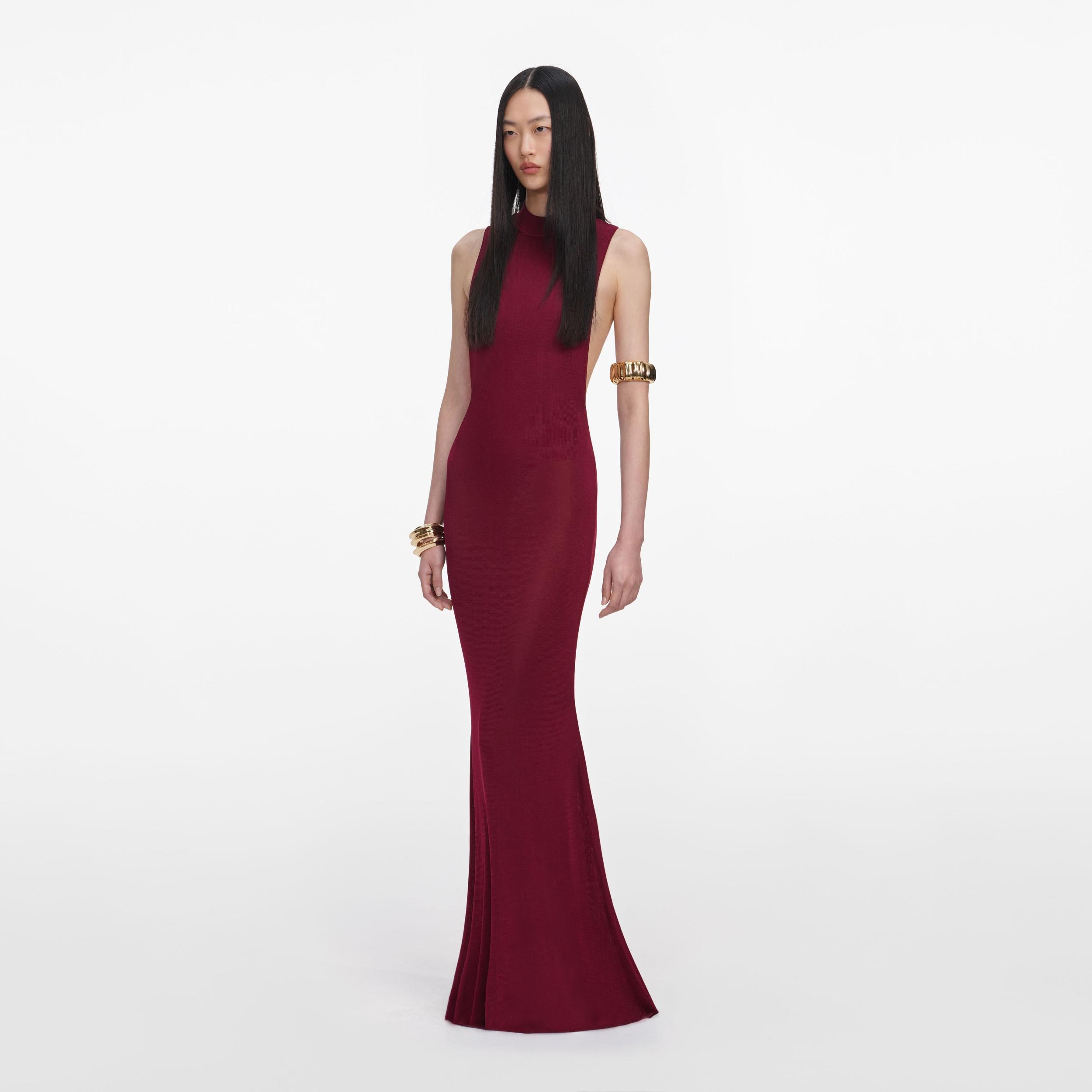 Sheer and sultry, this burgundy viscose maxi dress brings barely there appeal with its plunging side seams and backless cut. An elegant high neckline and internal bodysuit add chic details for a night to remember.True to sizeFabric has stretchLow cut racer backHigh neckMermaid hemModel is 5ft10/178cm and wears a size S