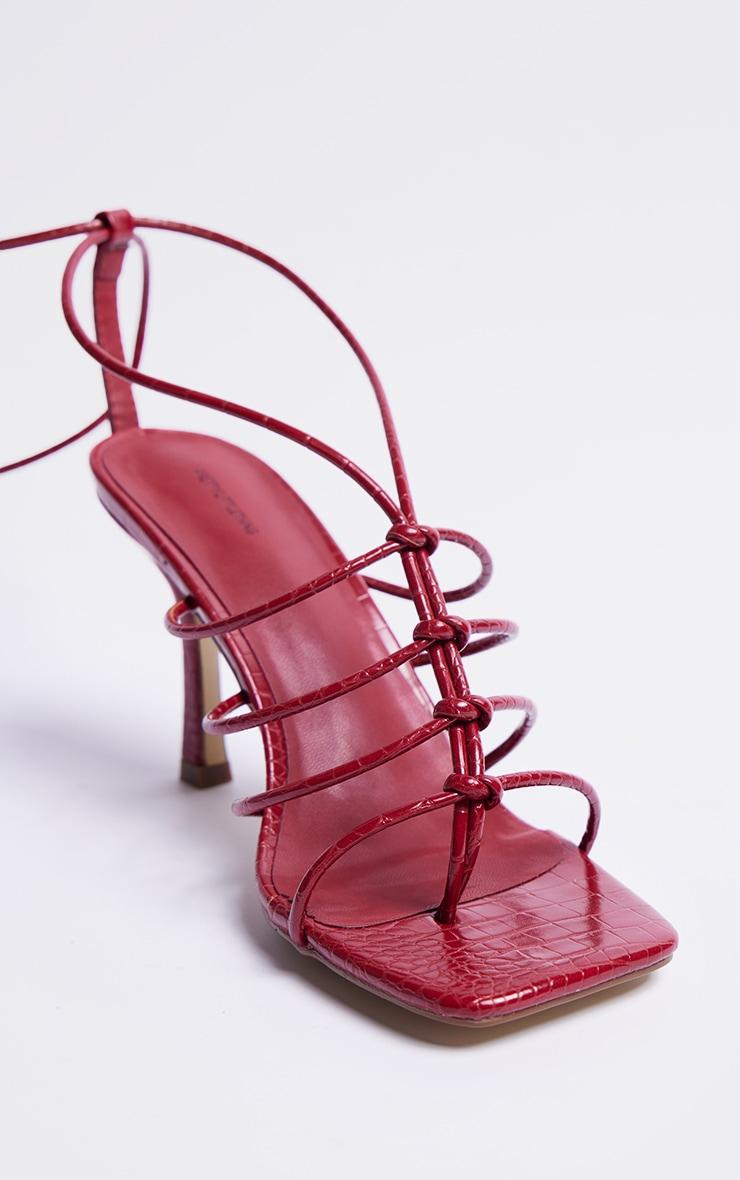 Inject some dreamy hues into your shoe collection with these burgundy snake PU knotted lace up sandals. Brought to you in a burgundy hue snake PU material with a lace up design, knotted detailing and a barely there style, we are obsessed. Just add these burgundy sandals to your weekend look for the perfect finishing touch. PU Tie-up 4inch Heel p]:!mb-0inch>Category: FootwearProduct type: Heeled SandalsColor: BurgundyMaterial: RubberOccasion: Evening