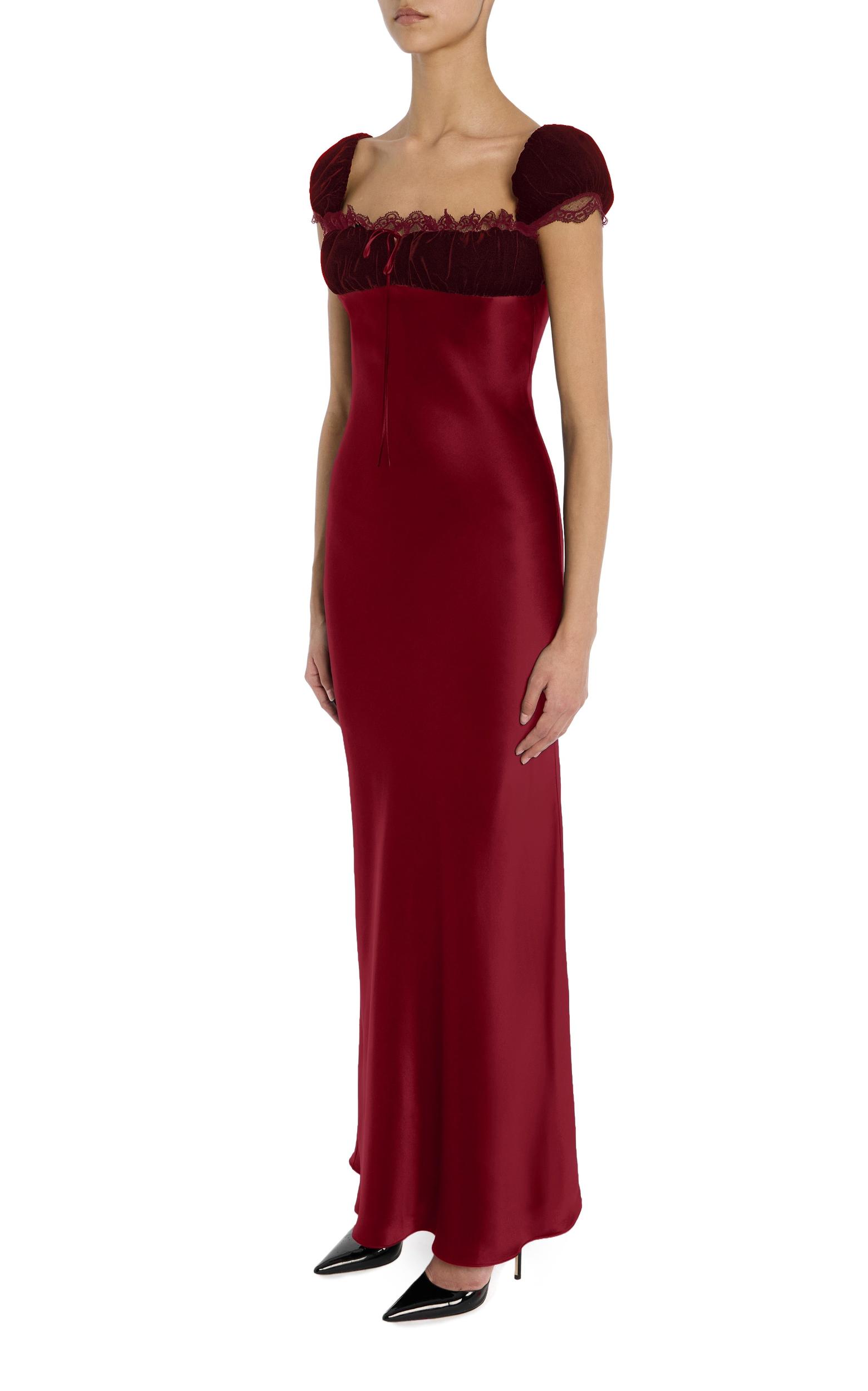 Cut on the bias in lustrous chartreuse silk charmeuse, this elegant maxi gown features sheered burgundy velvet cap sleeves and bodice and a center front tie, all of which are echoed by burgundy lace trim.