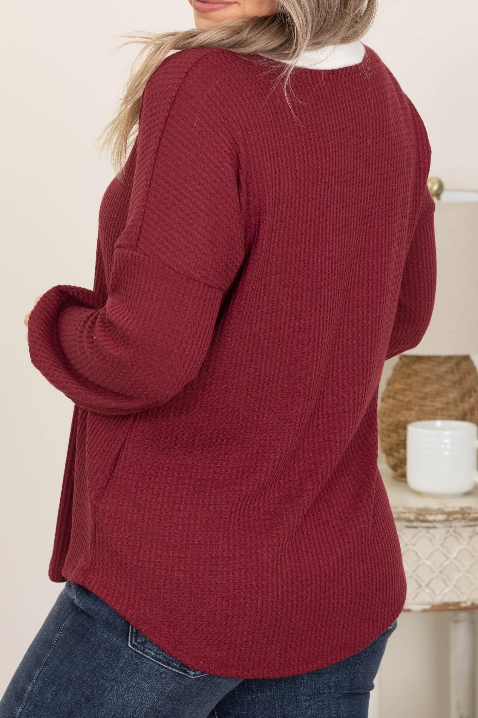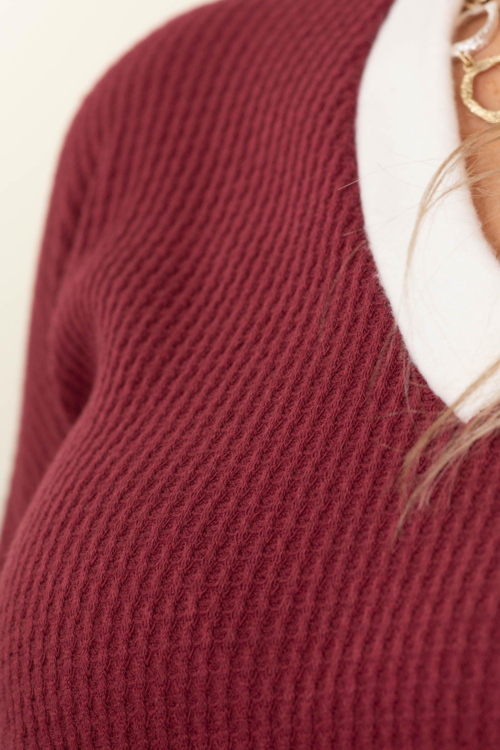 Product Details Colors: Burgundy, Ivory Print: Waffle Knit Neckline: V-Neck Sleeve: Long Sleeve Hemline: Round Brand: Lovely Melody Material and Care 62% Polyester 34% Rayon 4% Spandex Machine Wash Cold Hang/ Line Dry Made In The USA Size and Fit Small: Bust 42" Waist 40" Length 27" Medium: Bust 44" Waist 42" Length 27.5" Large: Bust 46" Waist 44" Length 28" X Large: Bust 48" Waist 46" Length 28.7" Erica is 5’7” and wearing her true size small